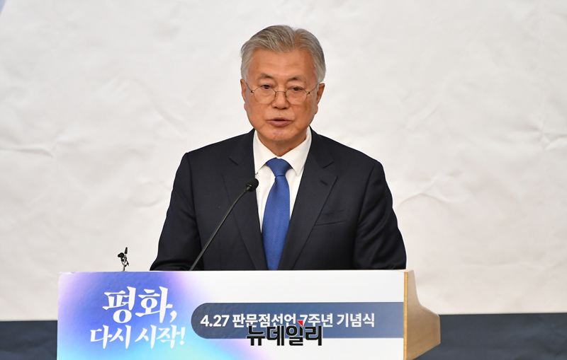 [포토] 판문점선언 7주년 기념식서 축사하는 문재인 전 대통령