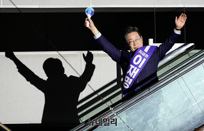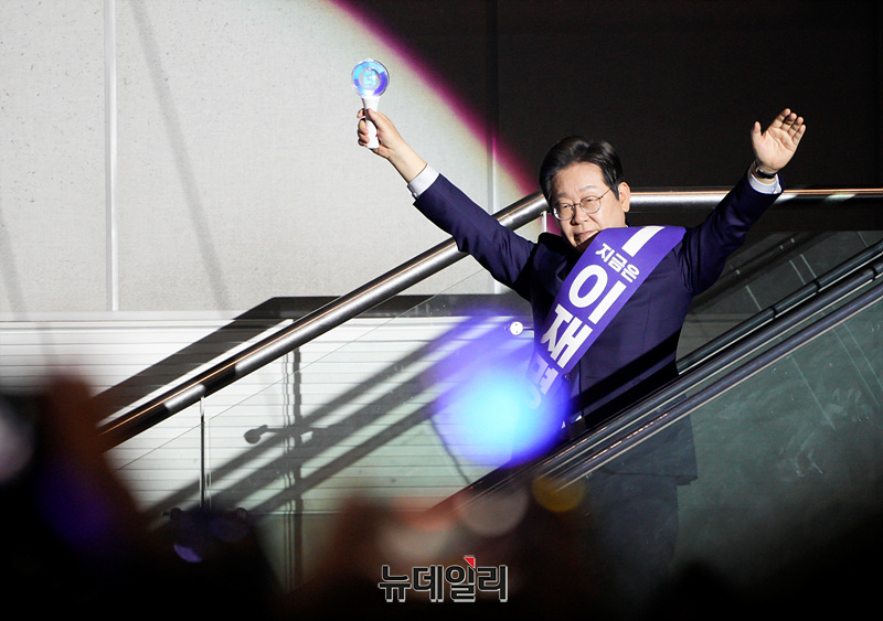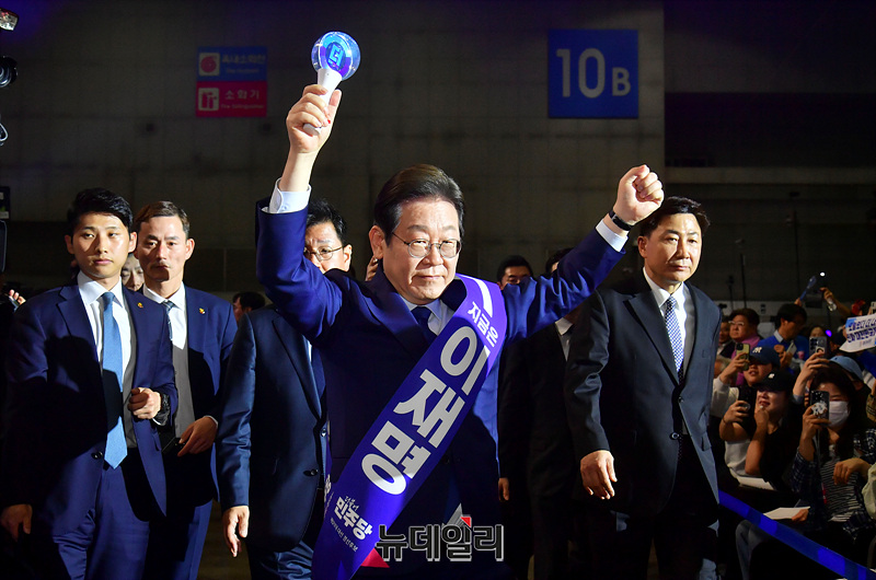 이재명 더불어민주당 대선 경선 후보가 27일 오후 경기 고양시 일산 킨텍스에서 열린 더불어민주당 제21대 대통령선거 후보자 선출을 위한 수도권·강원·제주 합동연설회에 입장하고 있다. (경기 고양=서성진 기자)