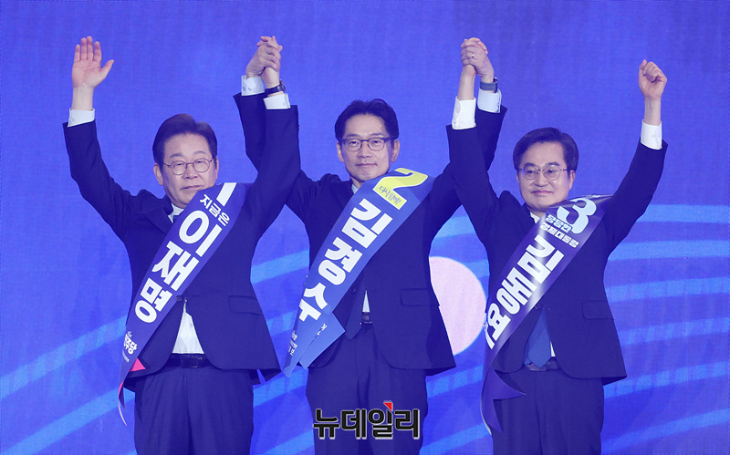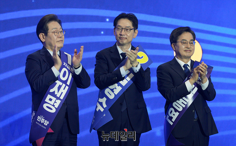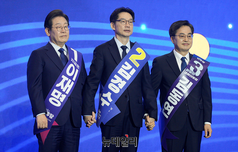 이재명, 김경수, 김동연 더불어민주당 대선 경선 후보가 27일 오후 경기 고양시 일산 킨텍스에서 열린 더불어민주당 제21대 대통령선거 후보자 선출을 위한 수도권·강원·제주 합동연설회에서 인사를 하고 있다. (경기 고양=서성진 기자)