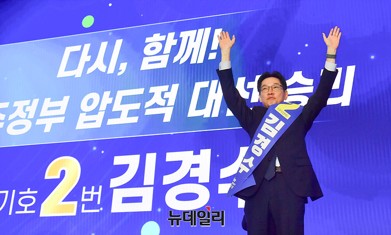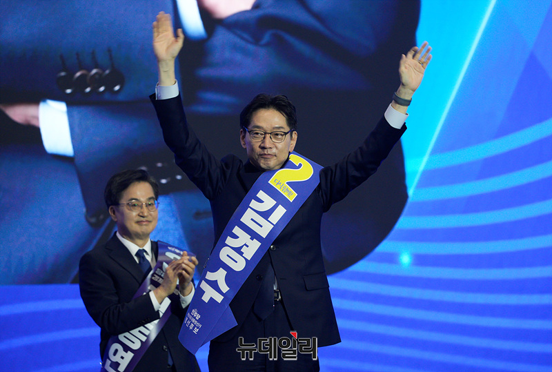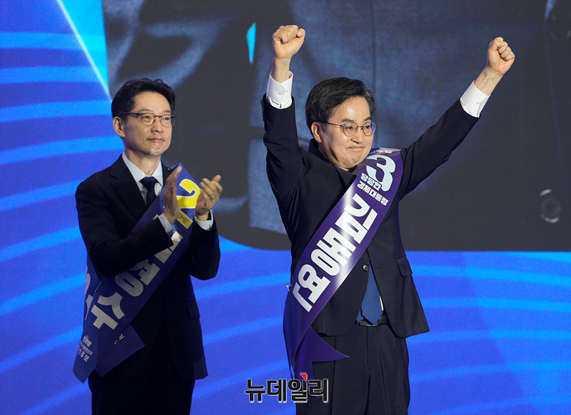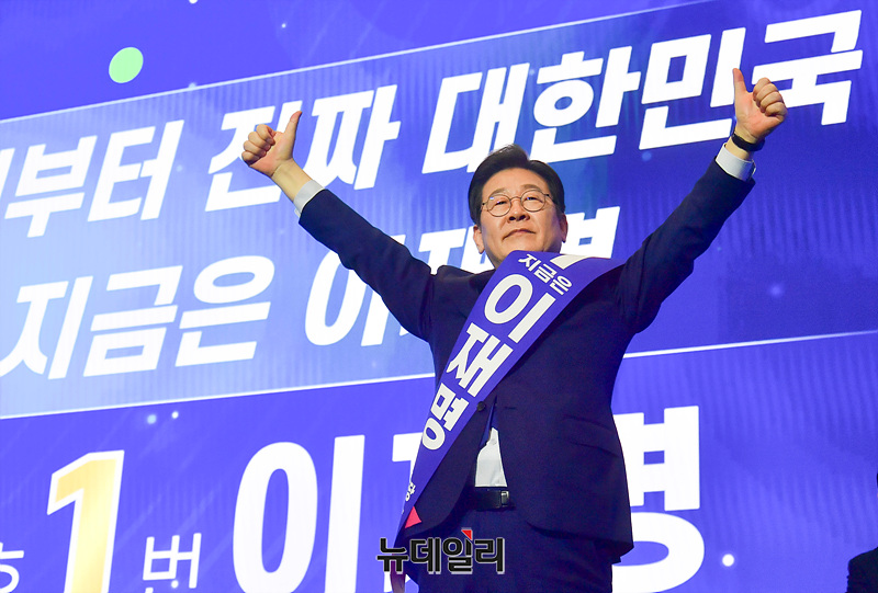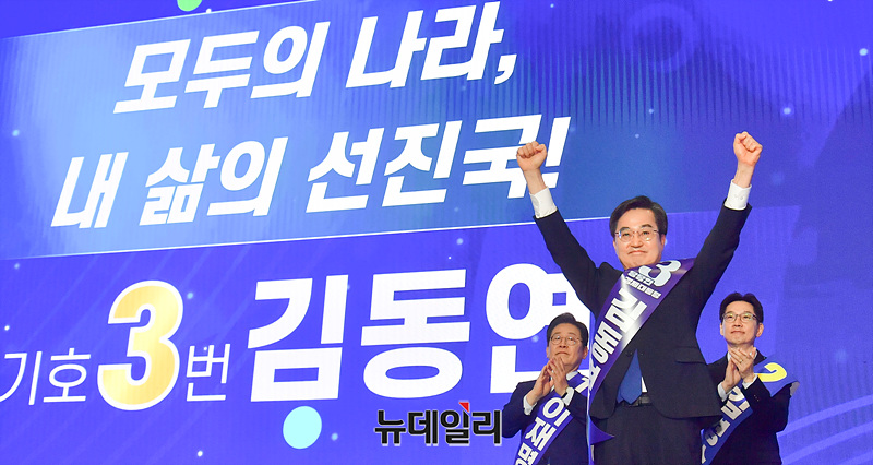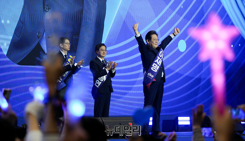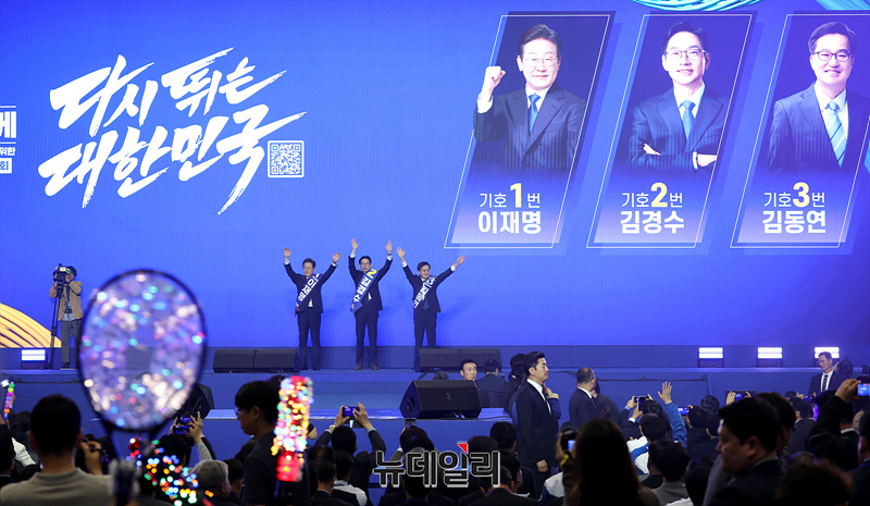 이재명, 김경수, 김동연 더불어민주당 대선 경선 후보가 27일 오후 경기 고양시 일산 킨텍스에서 열린 더불어민주당 제21대 대통령선거 후보자 선출을 위한 수도권·강원·제주 합동연설회에서 인사를 하고 있다. (경기 고양=서성진 기자)