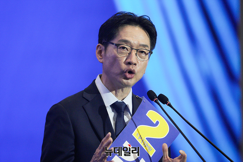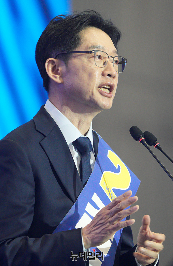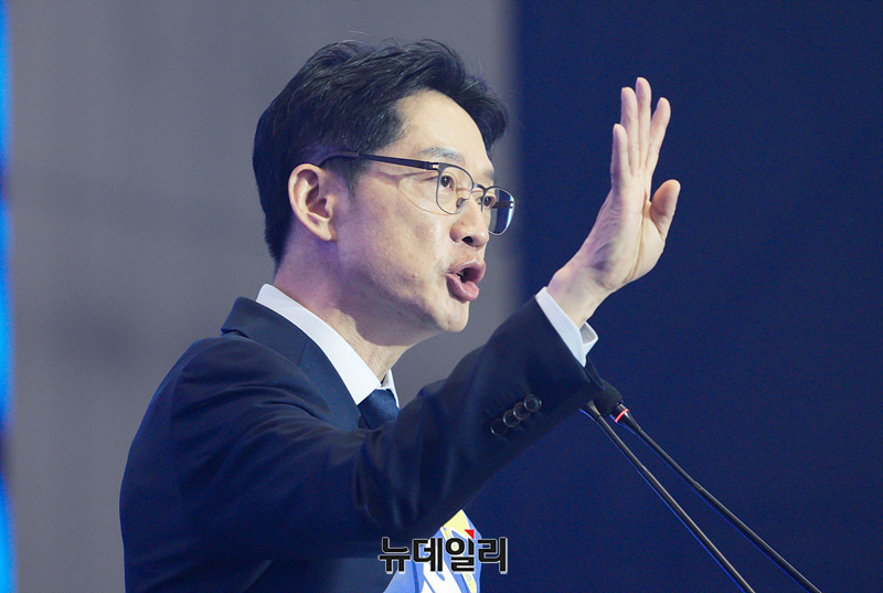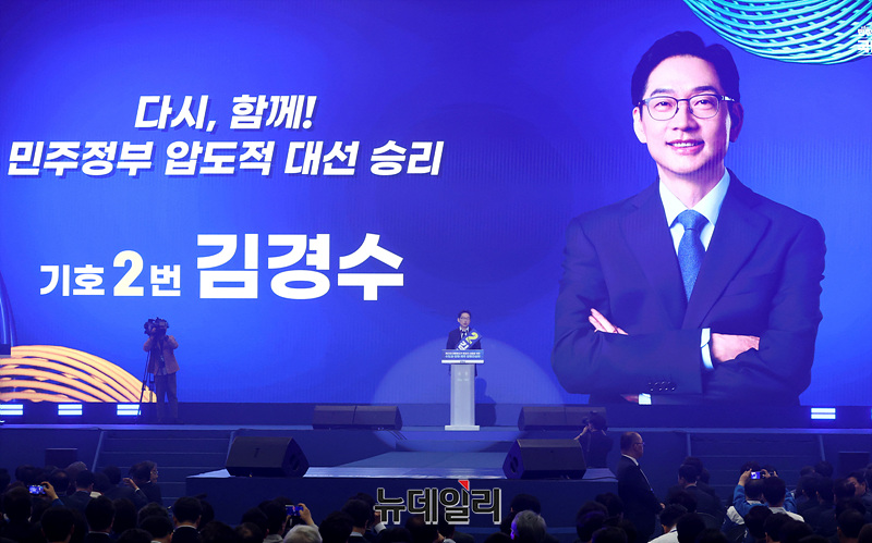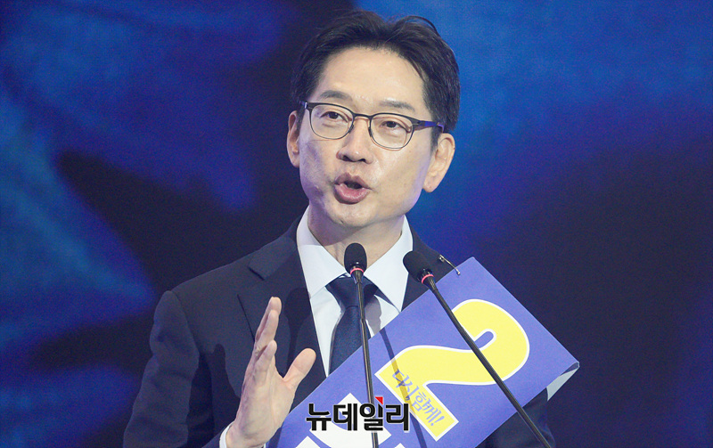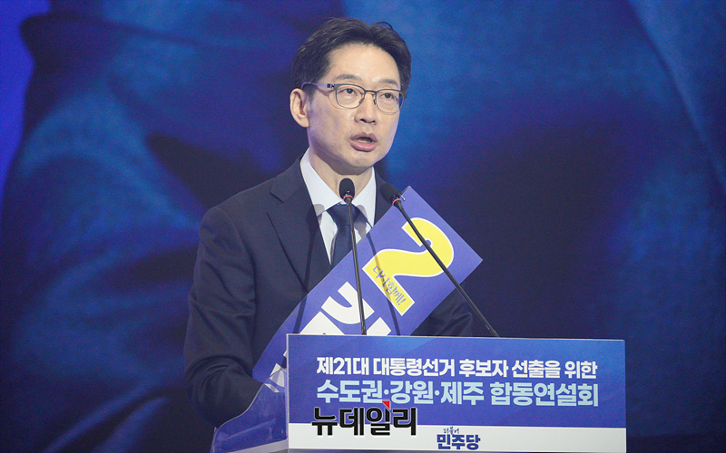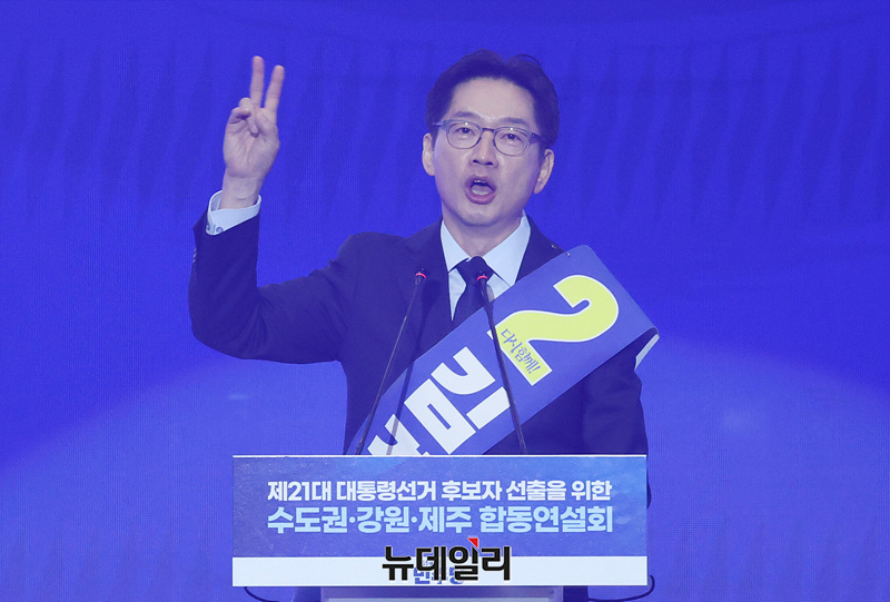 김경수 더불어민주당 대선 경선 후보가 27일 오후 경기 고양시 일산 킨텍스에서 열린 더불어민주당 제21대 대통령선거 후보자 선출을 위한 수도권·강원·제주 합동연설회에서 정견발표를 하고 있다. (경기 고양=서성진 기자)