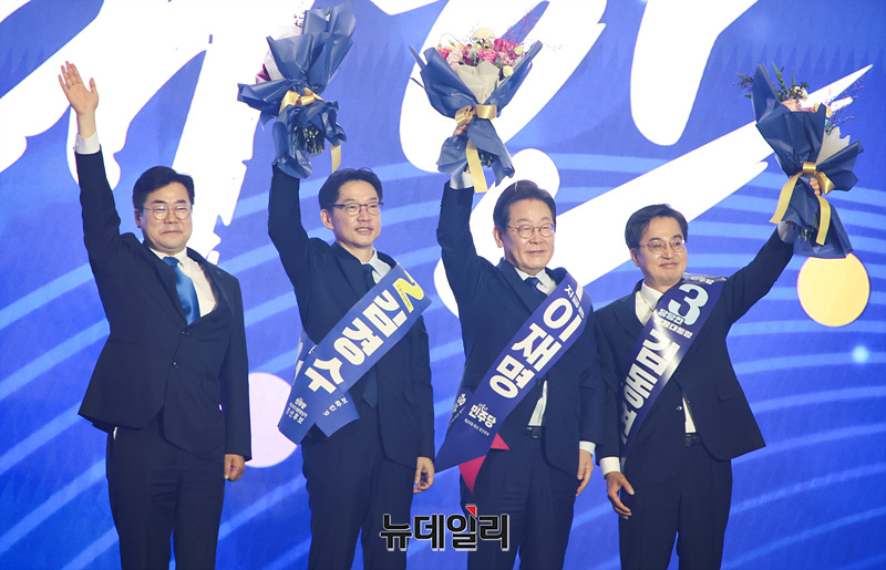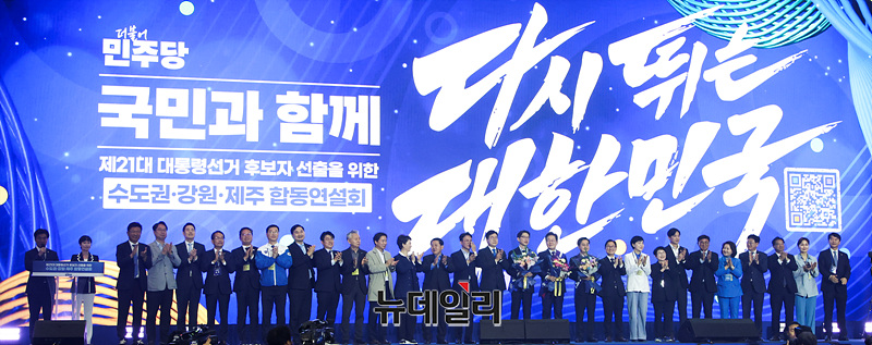 이재명, 김동연, 김경수 더불어민주당 대선 경선 후보를 비롯한 당 지도부가 27일 오후 경기 고양시 일산 킨텍스에서 열린 더불어민주당 제21대 대통령선거 후보자 선출을 위한 수도권·강원·제주 합동연설회에서 기념촬영을 하고 있다. (경기 고양=서성진 기자)
