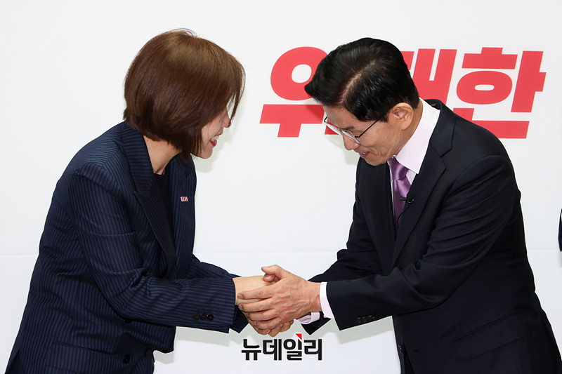 김미애 국민의힘 의원과 김문수 대선 경선 후보가 28일 오전 서울 여의도 대하빌딩에 마련된 캠프 사무실에서 악수를 하고 있다.