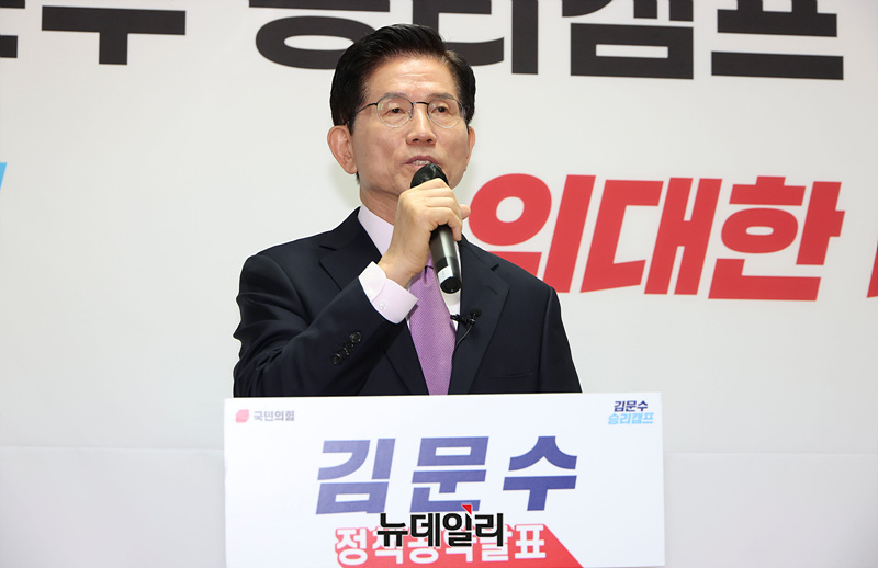 김문수 국민의힘 대선 경선 후보가 28일 오전 서울 여의도 대하빌딩에 마련된 캠프 사무실에서 정책공약을 발표하고 있다.