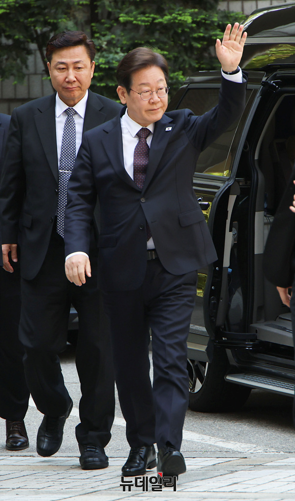 [포토] 공판 출석하며 인사하는 이재명 민주당 대선후보