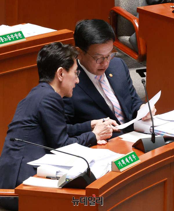 최상목 경제부총리 겸 기획재정부 장관과 김윤상 기재2차관 28일 오전 국회에서 추가경정예산안을 심사를 위해 열린 국회 예산결산특별위원회 전체회의에서 대화를 나누고 있다.
