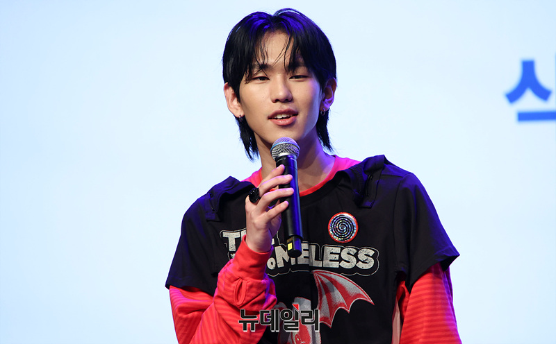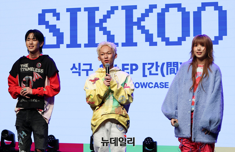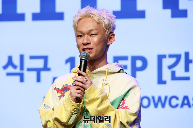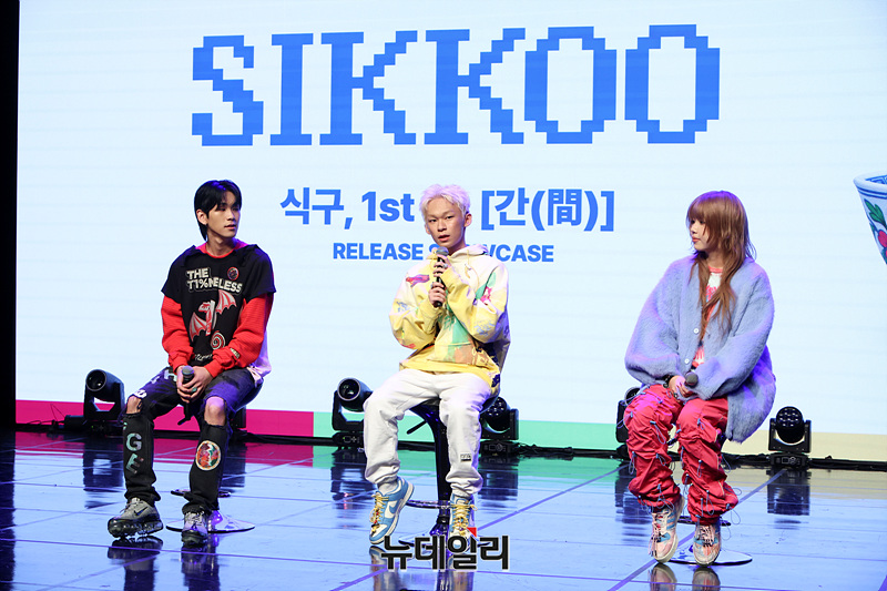 그룹 식구 요시, 구민재, 이백이 29일 오후 서울 강남구 일지아트홀에서 열린 데뷔 앨범 '간 (間)' 발매 기념 쇼케이스에서 소감을 밝히고 있다.