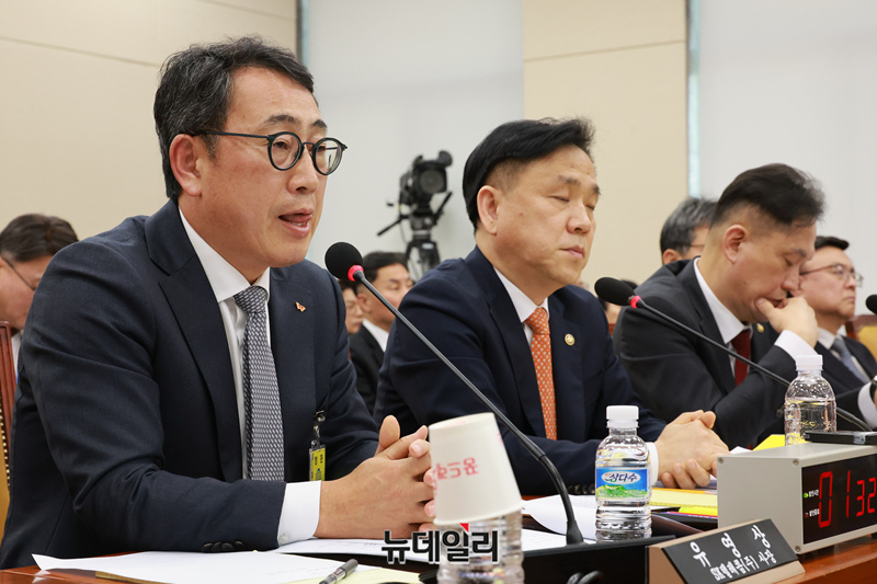 유영상 SK텔레콤 대표이사가 30일 오전 국회 과학기술정보방송통신위원회의에서 열린 방송통신 분야 청문회에서 유심 해킹 사태와 관련한 질의에 난처한 표정을 짓고 있다.