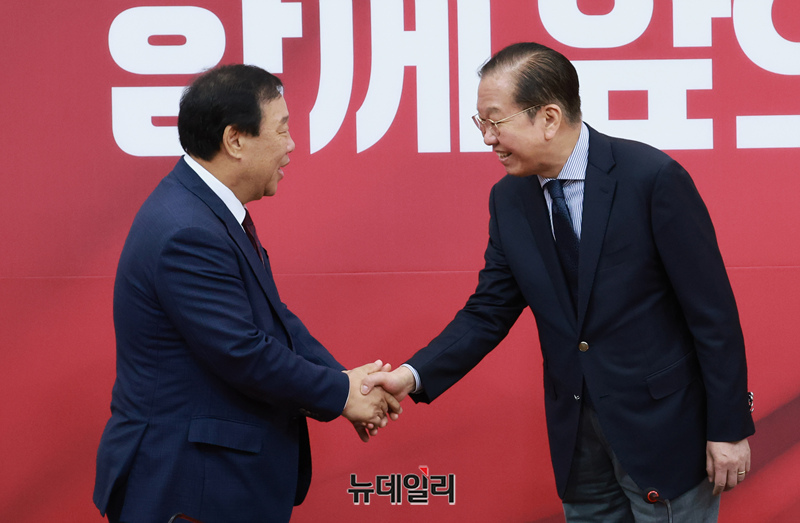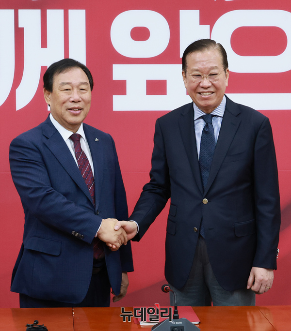 권영세 국민의힘 비상대책위원장이 30일 오전 국회에서 최민호 세종시장과 면담에 앞서 악수하고 있다.