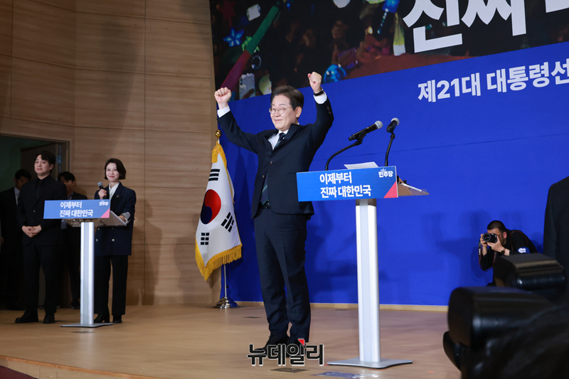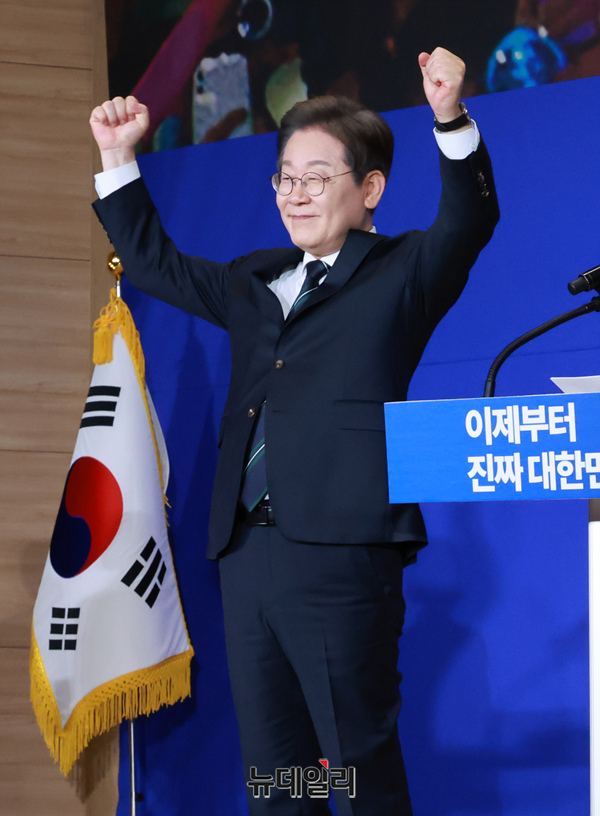 [포토] 두손 번쩍든 이재명 민주당 대선 후보