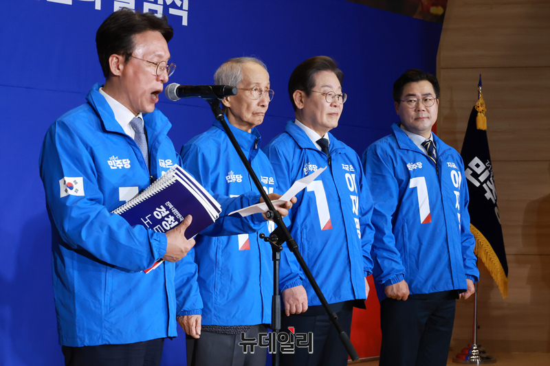 이재명 더불어민주당 대선 후보와 윤여준, 박찬대 상임총괄선대위원장이 30일 오후 국회 의원회관에서 열린 더불어민주당 제21대 대통령선거 '진짜 대한민국' 중앙선거대책위원회 출범식에서 국민의 목소리에 귀를 기울이겠다는 의미의 '경청 노트'를 전달받고 있다.