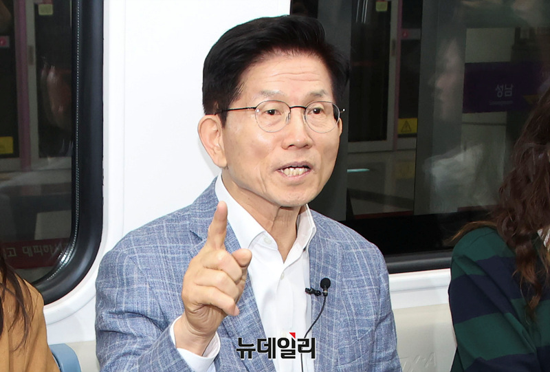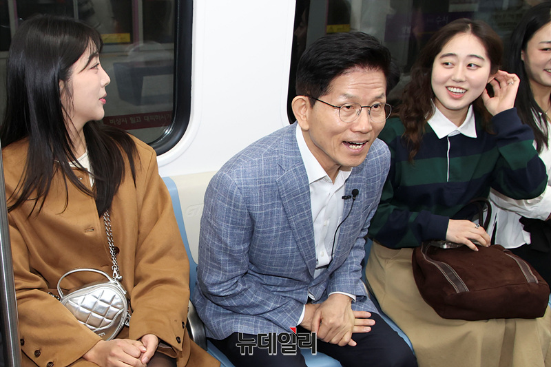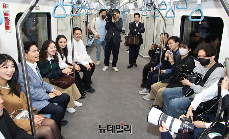 김문수 국민의힘 대선 경선 후보가 2일 오전 서울 강남구 수서역에서 청년들과 함께 GTX-A에 탑승해 대화를 나누고 있다.