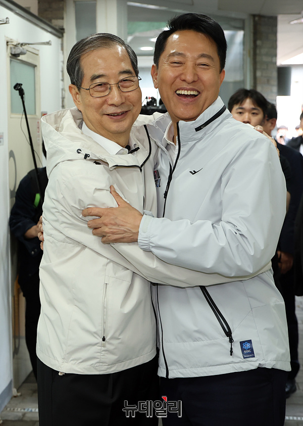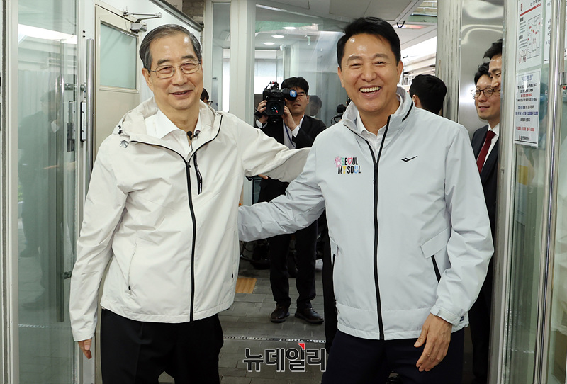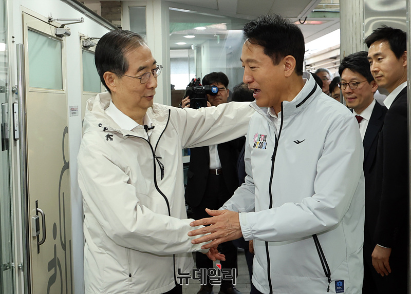 제21대 대통령 선거에 출마한 한덕수 전 총리가 2일 서울 종로구 주민공동시설 '새뜰집'에서 오세훈 서울시장과 인사하고 있다.