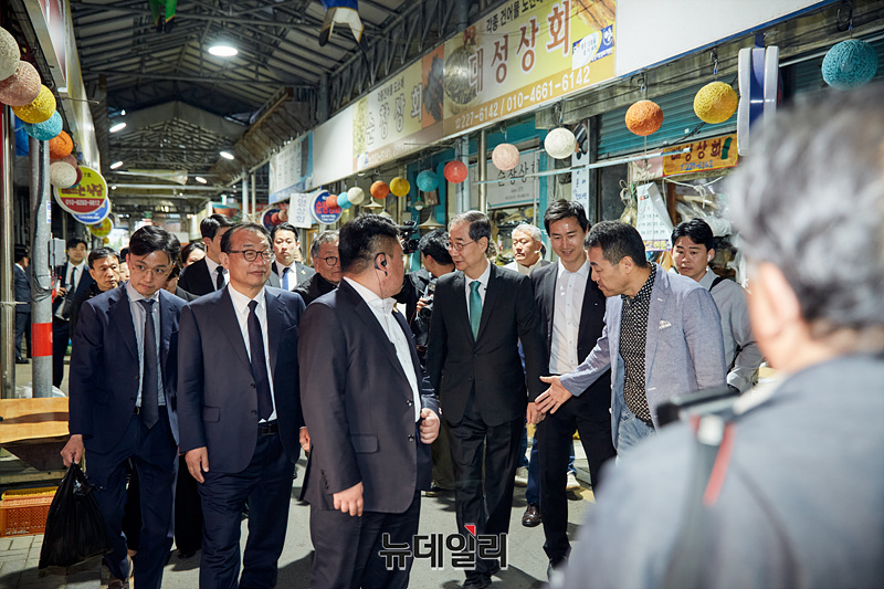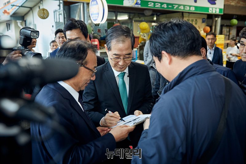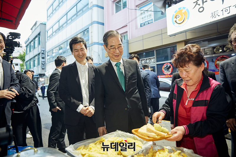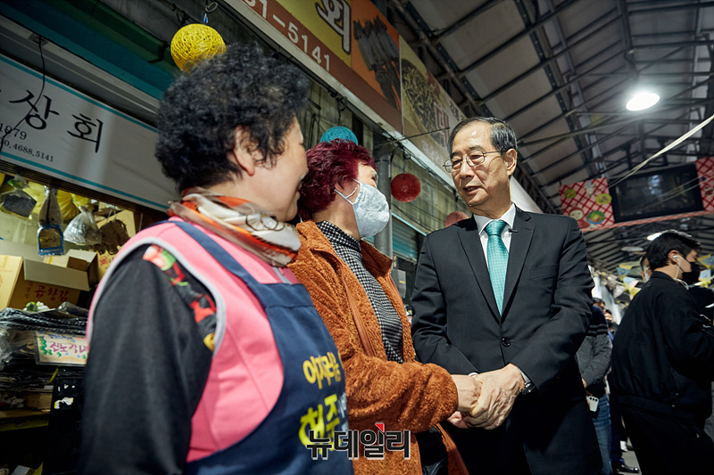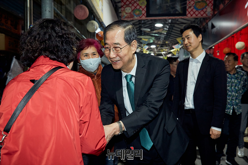 한덕수 전 국무총리가 2일 오후 광주 동구 대인시장에서 시장상인들을 만나 인사를 나누고 있다. (사진=한덕수 캠프)