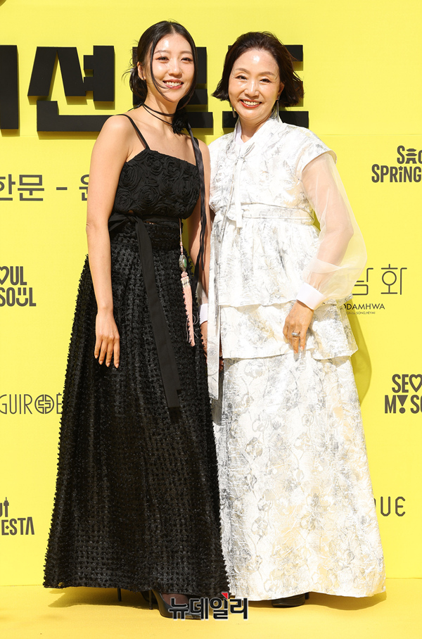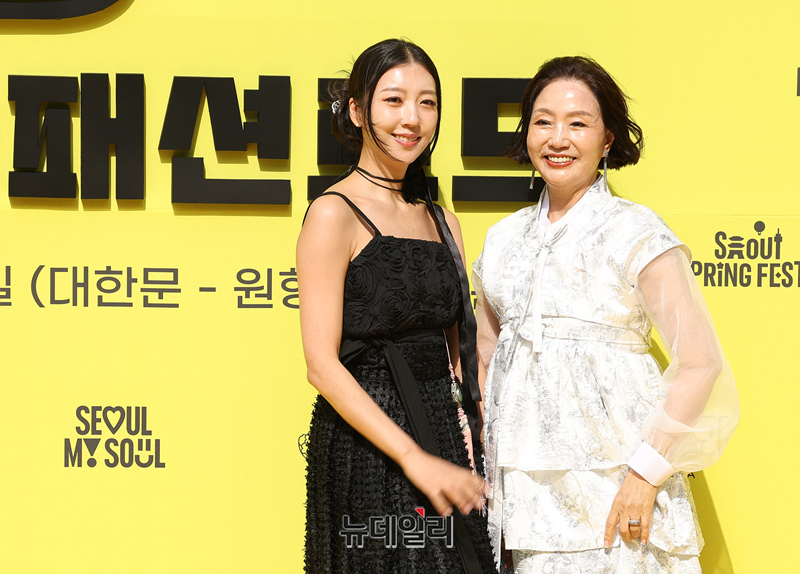 인플루언서 신채민, 이선숙이 2일 오후 서울 중구 덕수궁길에서 열린 '2025 서울패션로드@정동' 패션쇼를 찾아 포즈를 취하고 있다.