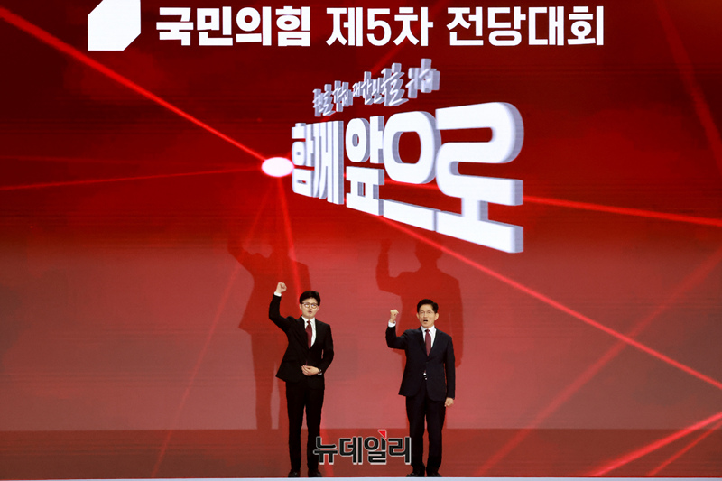 국민의힘 한동훈·김문수 대선 경선 후보가 3일 오후 경기 고양시 일산 킨텍스에서 열린 국민이힘 제21대 대통령선거 후보자 선출을 위한 전당대회에 당원들에게 인사를 하고 있다. (경기 고양=이종현 기자)