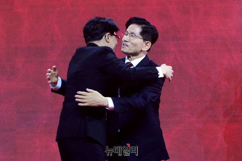 국민의힘 한동훈·김문수 대선 경선 후보가 3일 오후 경기 고양시 일산 킨텍스에서 열린 국민이힘 제21대 대통령선거 후보자 선출을 위한 전당대회에서 포옹을 하고 있다. (경기 고양=이종현 기자)