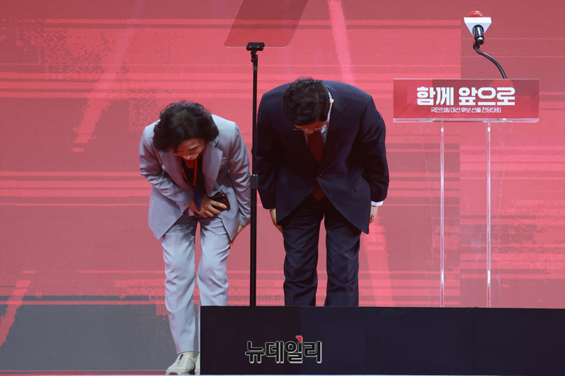국민의힘 대선 후보로 선출된 김문수 후보가 3일 오후 경기 고양시 일산 킨텍스에서 열린 국민이힘 제21대 대통령선거 후보자 선출을 위한 전당대회에서 수락연설을 중 부인 설난영 여사와 함께 인사하고 있다. (경기 고양=이종현 기자)