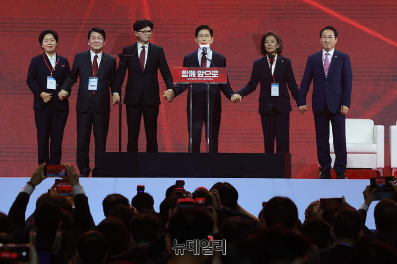 국민의힘 대선 후보로 선출된 김문수 후보와 경선 후보들이 3일 오후 경기 고양시 일산 킨텍스에서 열린 국민이힘 제21대 대통령선거 후보자 선출을 위한 전당대회에서 손을 들어 인사를 하고 있다. (경기 고양=이종현 기자)