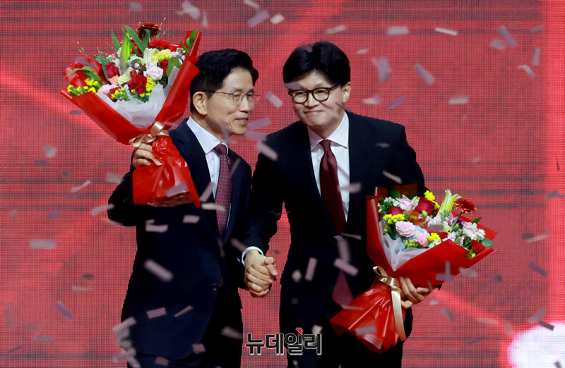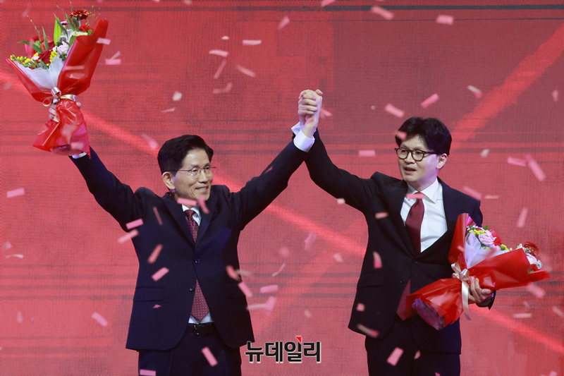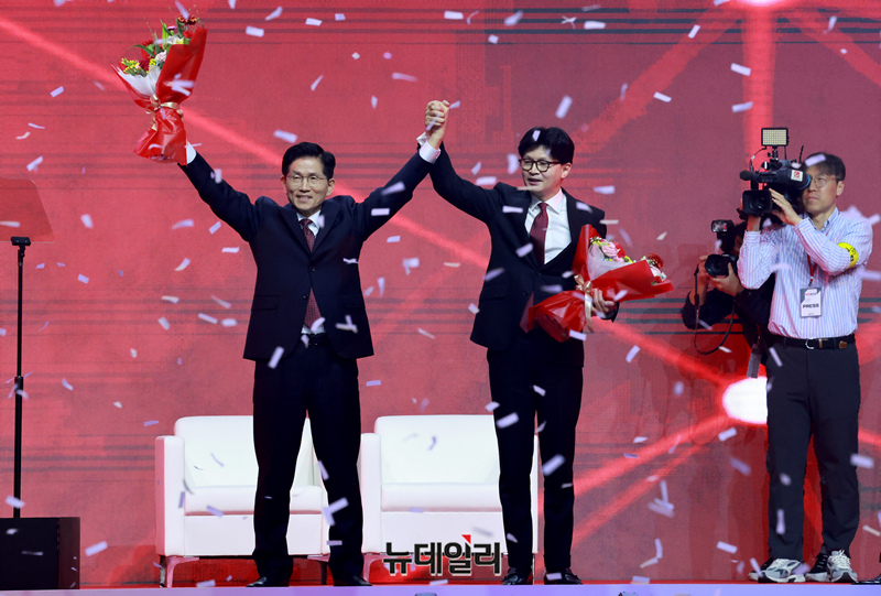 국민의힘 대선 후보로 선출된 김문수 후보가 3일 오후 경기 고양시 킨텍스에서 열린 국민의힘 전당대회에서 꽃다발을 받은 뒤 한동훈 후보와 함께 인사하고 있다. (경기 고양=이종현 기자)