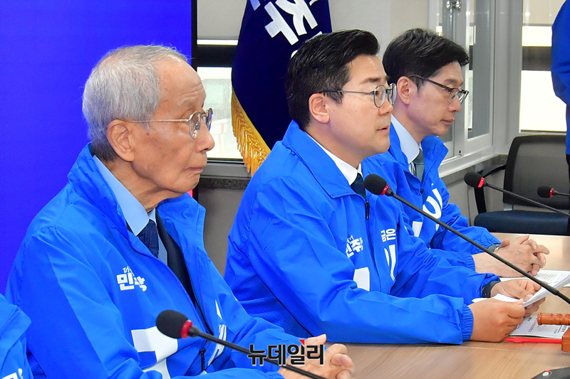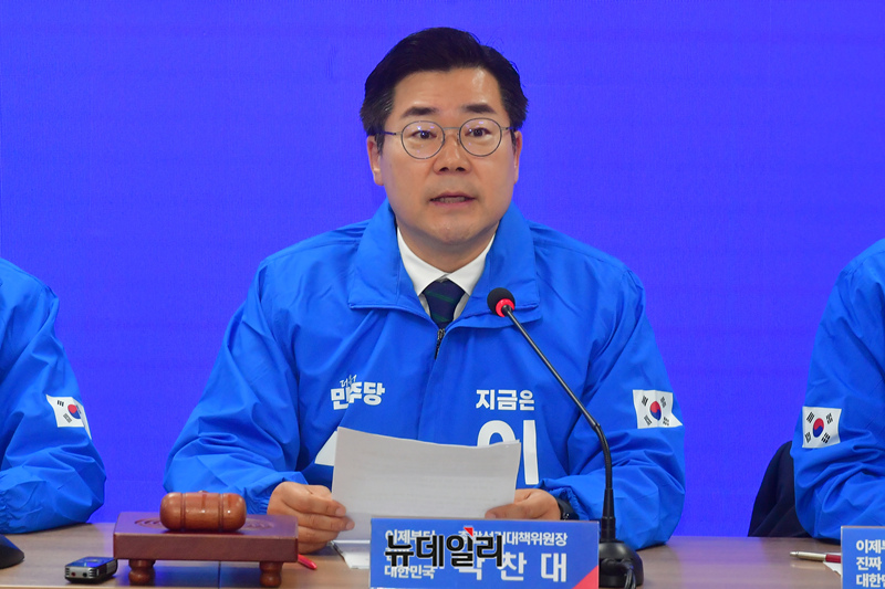 박찬대 더불어민주당 상임 총괄선대위원장이 7일 서울 여의도 중앙당사에서 열린 중앙선거대책위원회의에 참석해 발언을 하고 있다.