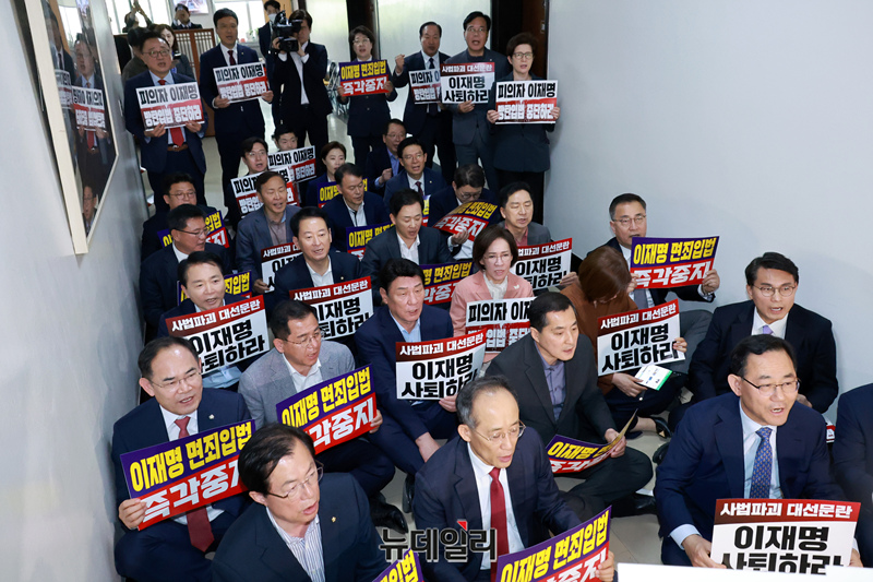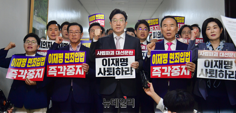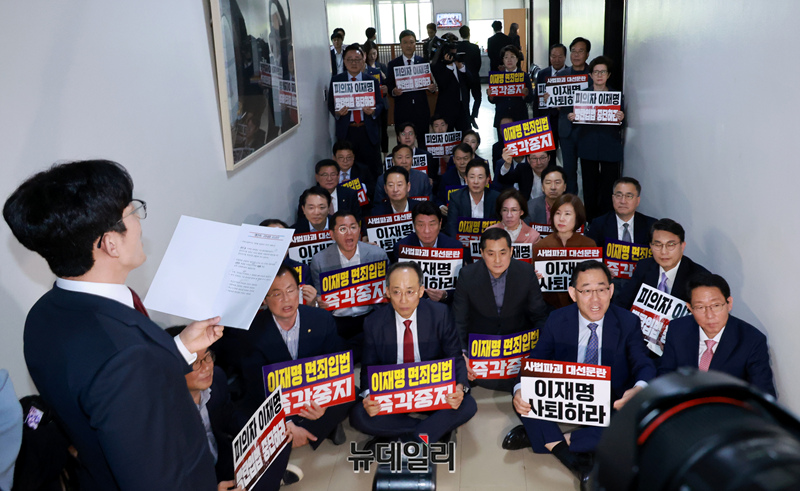 권성동 국민의힘 원내대표 및 소속 의원들이 7일 오후 국회 행정안전위원회 회의실 앞 복도에서 공직선거법 개정안 의결 관련 규탄대회를 갖고 있다.