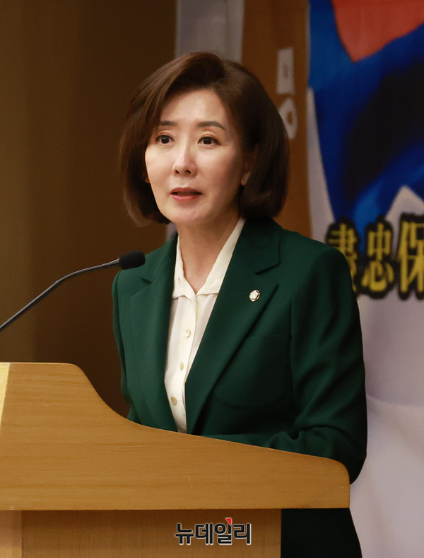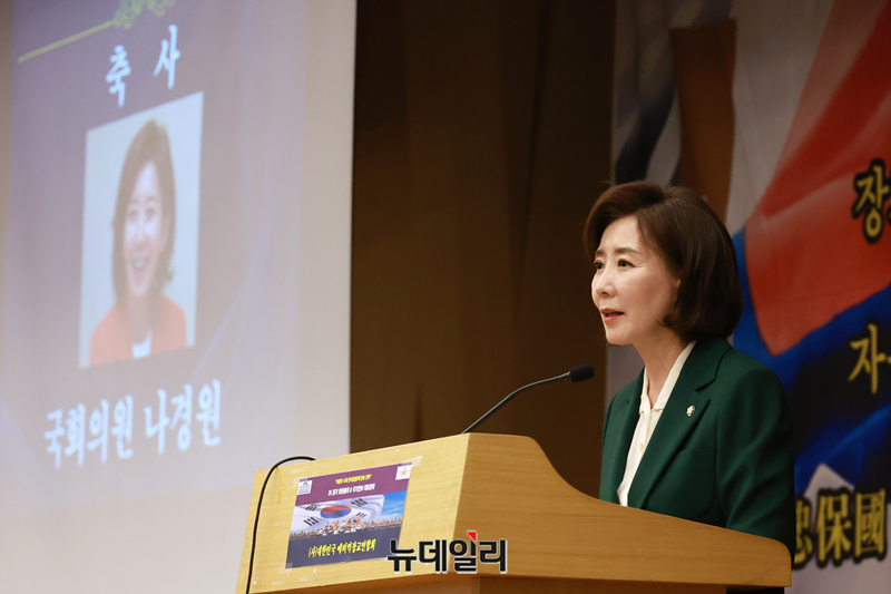 나경원 국민의힘 의원이 7일 오후 국회 도서관에서 열린 '트럼프 시대 국가안전보장 대토론회'에 참석해 축사를 하고 있다.