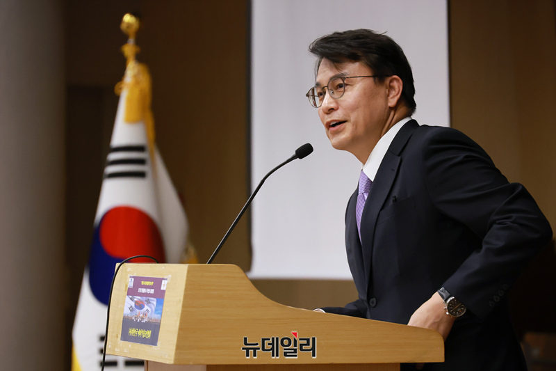 윤상현 국민의힘 의원이 7일 오후 국회 도서관에서 열린 '트럼프 시대 국가안전보장 대토론회'에 참석해 축사를 하고 있다.