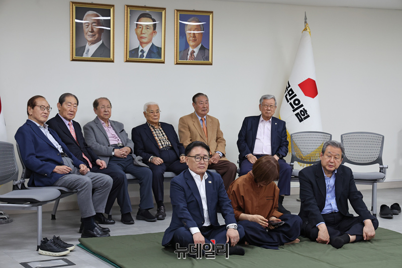 김무성 전 새누리당 대표 및 국민의힘 상임고문단과 김미애 의원이 7일 서울 여의도 중앙당사에서 대선후보 단일화를 촉구하며 단식농성을 하고 있다. (앞줄 왼쪽부터 유준상 상임고문·김미애 의원·김무성 상임고문·뒷줄 왼쪽부터 신경식·김동욱·김종하·목요상·권해옥·유흥수 고문.) (사진=국민의힘)