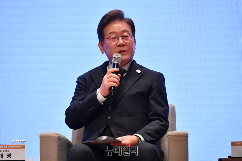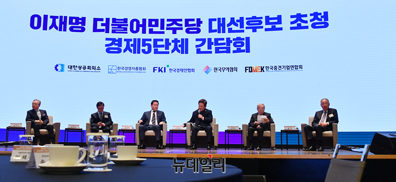이재명 더불어민주당 대통령선거 후보가 8일 오전 서울 중구 대한상공회의소에서 열린 경제5단체장과 간담회에 참석해 발언을 하고 있다.