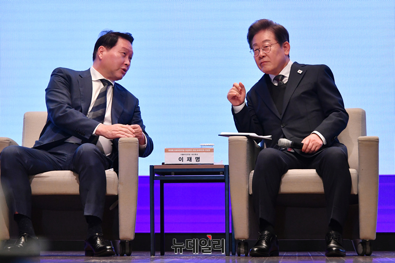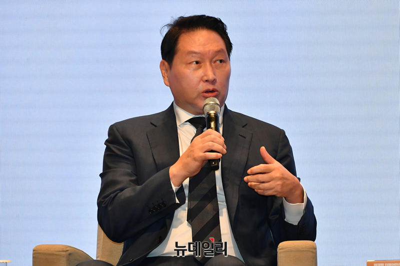 최태원 대한상공회의소 회장이 8일 서울 중구 대한상공회의소에서 열린 대선후보 초청 경제5단체 간담회에서 발언을 하고 있다.