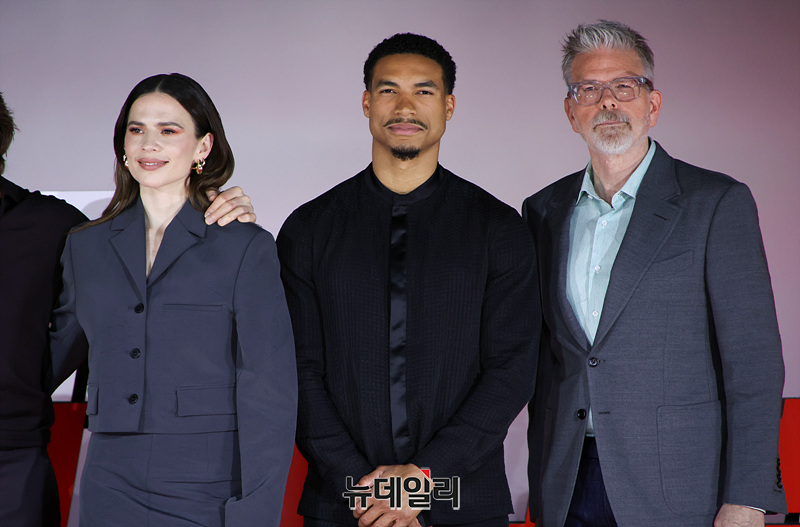 톰 크루즈, 크리스토퍼 맥쿼리 감독, 헤일리 앳웰, 사이먼 페그, 폼 클레멘티에프, 그렉 타잔 데이비스가 8일 오후 서울 송파구 롯데시네마 월드타워에서 열린 영화 '미션 임파서블: 파이널 레코닝' 프레스 컨퍼런스에서 포즈를 취하고 있다.
