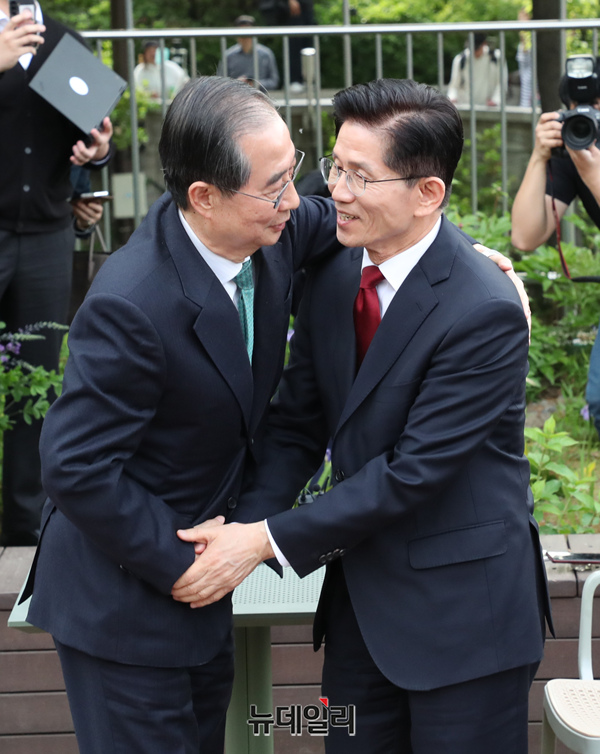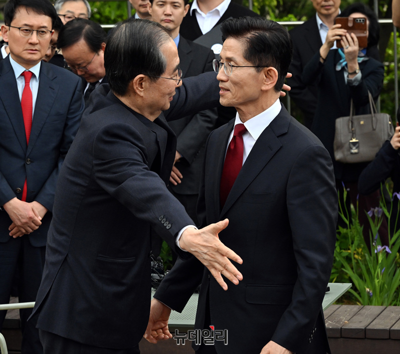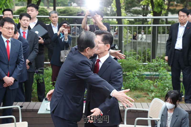 [포토] '빈손 회동' 어색한 포옹하는 김문수·한덕수