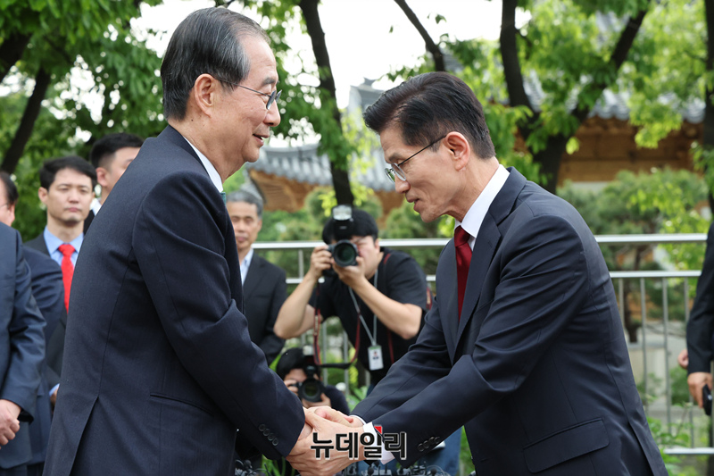 김문수 국민의힘 대선 후보와 한덕수 무소속 대선 예비후보가 8일 오후 국회 강변서재에서 후보 단일화 관련 회동을 마친 뒤 이석하고 있다.
