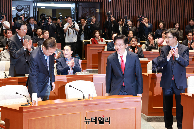 김문수 국민의힘 대선 후보가 9일 오전 국회에서 열린 의원총회에 참석하며 박수를 받고 있다.
