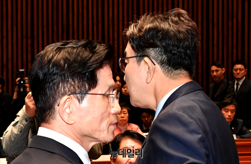김문수 국민의힘 대선 후보가 9일 오전 국회에서 열린 의원총회에서 밖으로 나서며 권성동 원내대표와 대화를 하고 있다.