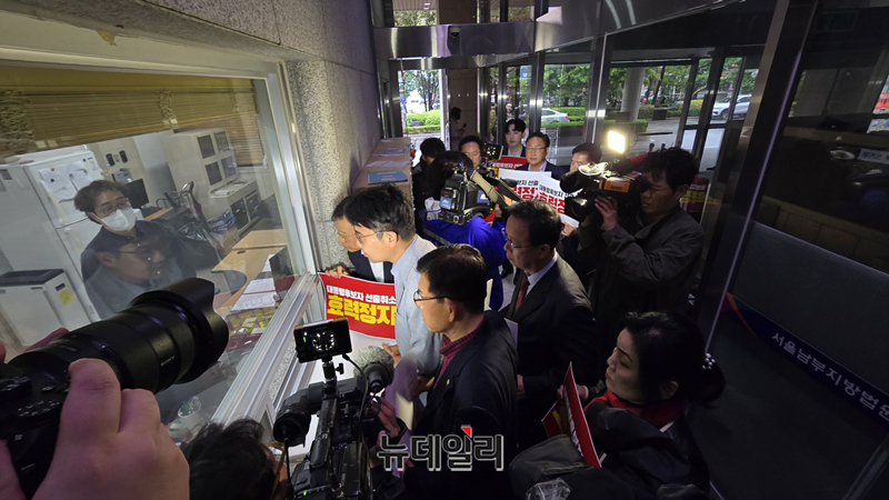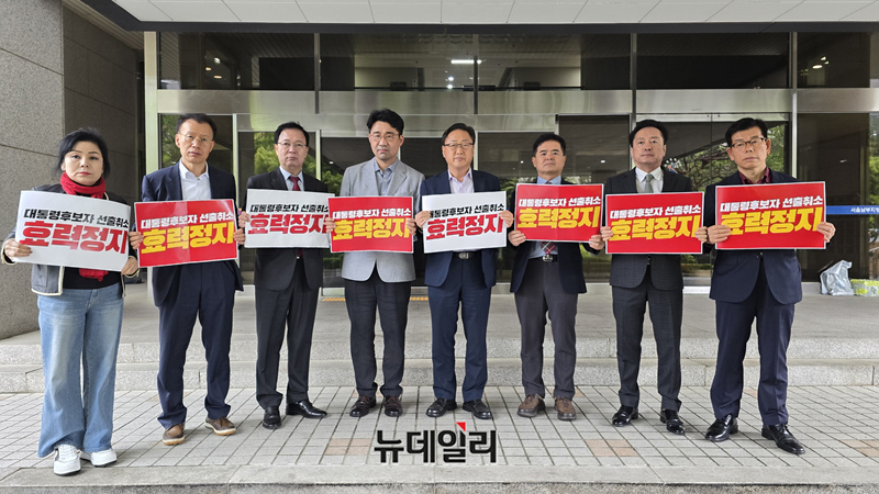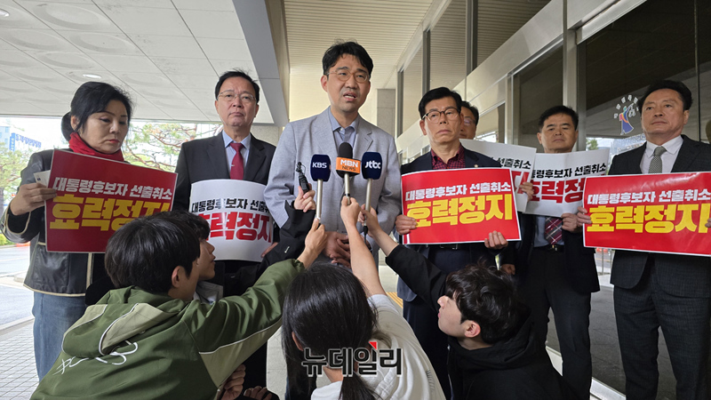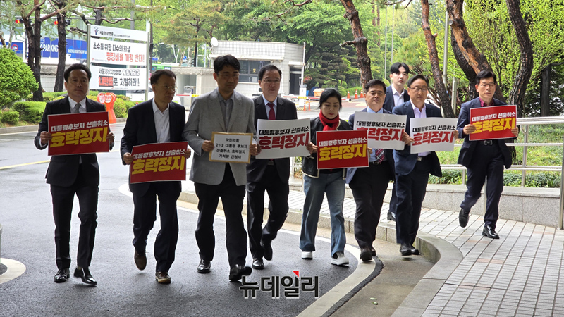 김문수 전 국민의힘 대선 후보측이 10일 오후 서울 양천구 서울남부지법에서 제21대 대통령후보 선출취소 효력정지 가처분을 접수하고 있다. (사진=김문수 캠프)