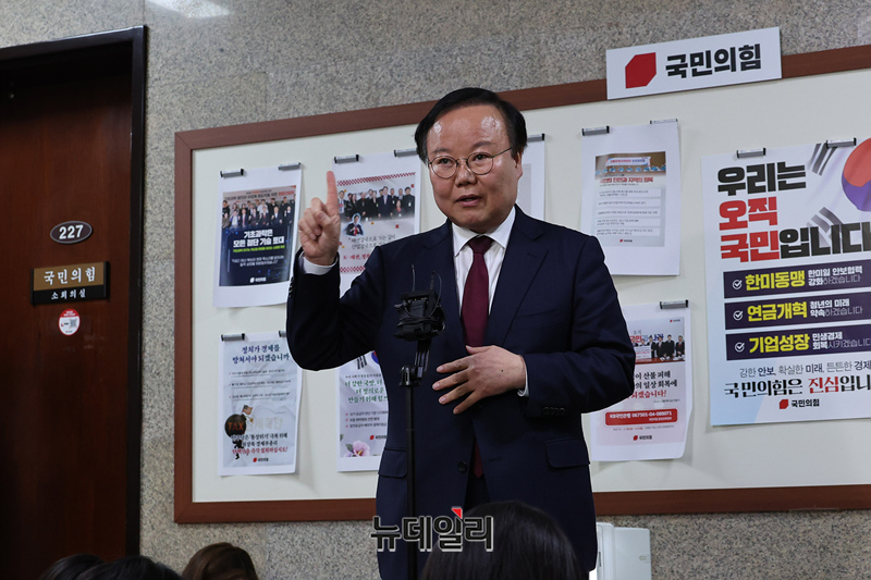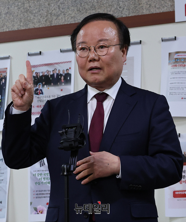 김재원 김문수 대선후보 비서실장이 10일 국회 본관에서 열린 한덕수 대선 예비후보측과 단일화 실무 협상을 마치고 취재진의 질문에 답하고 있다.