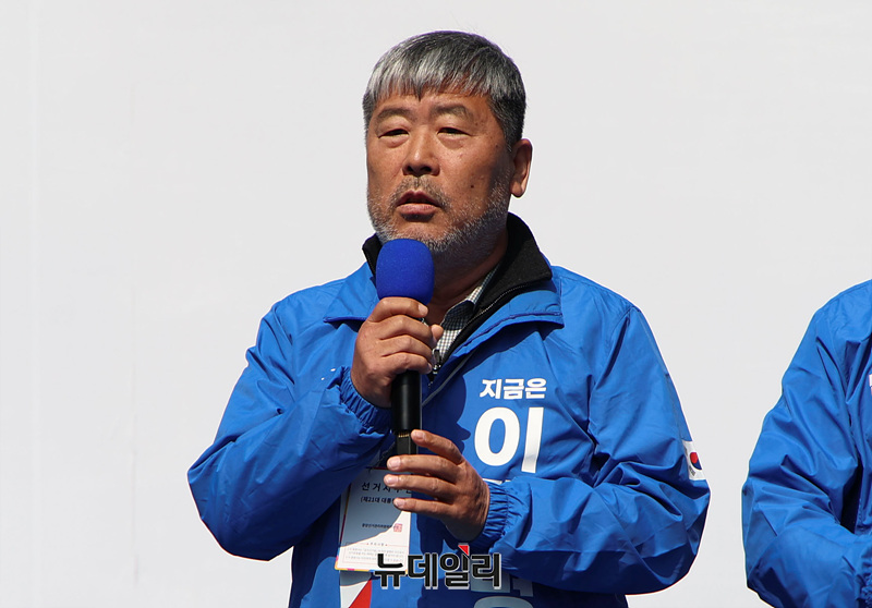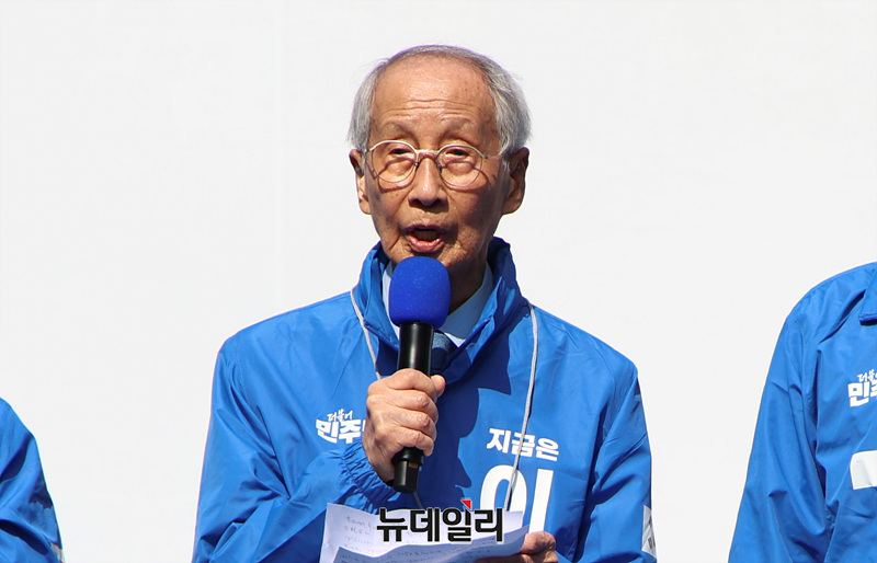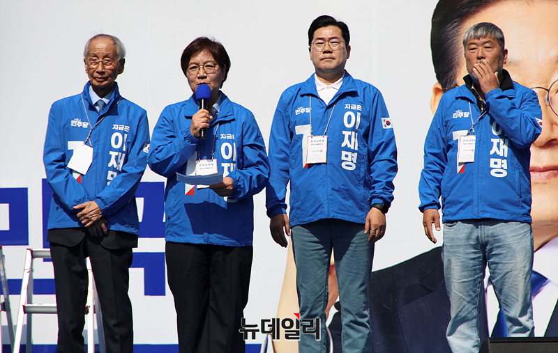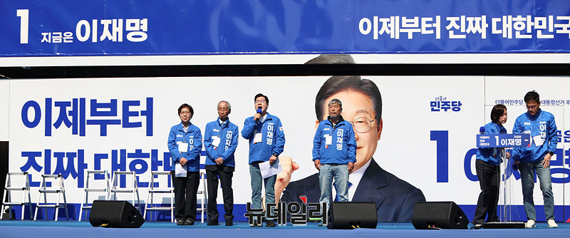 제21대 대통령선거 공식 선거운동이 시작된 12일 오전 서울 종로구 청계광장에서 열린 더불어민주당 중앙선거대책위원회 출범식 및 첫 유세에서 윤여준 상임총괄선대위원장, 박찬대 상임총괄선대위원장 등 선대위원장들이 발언하고 있다.