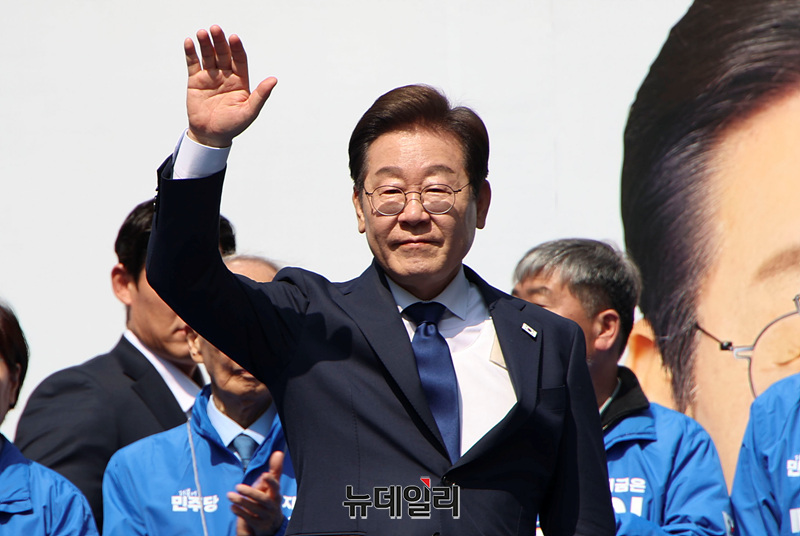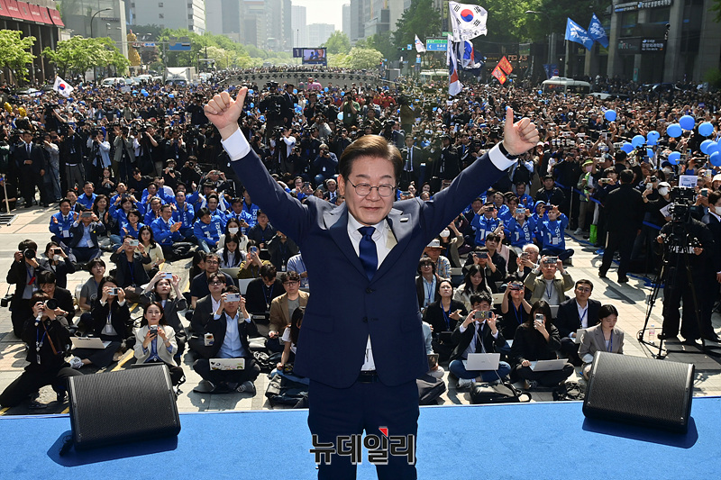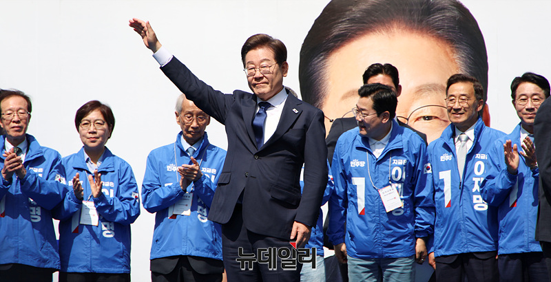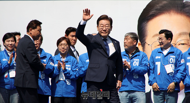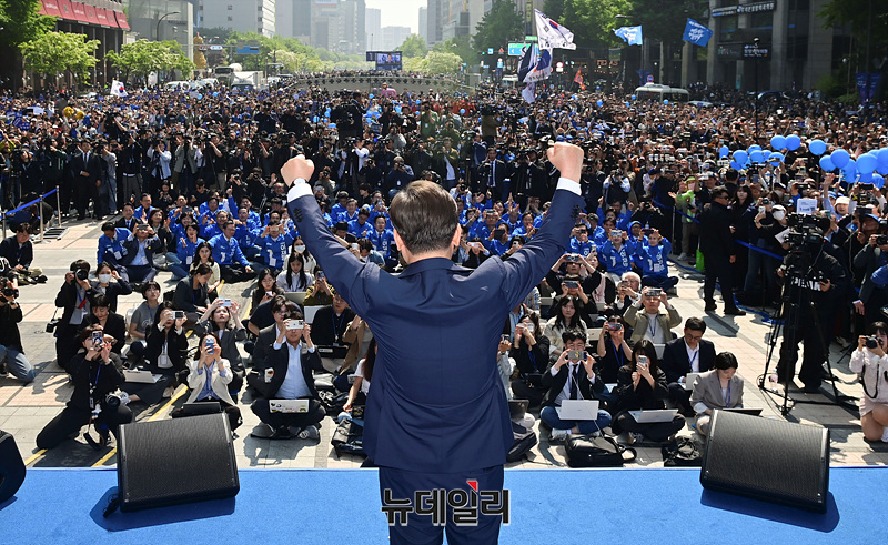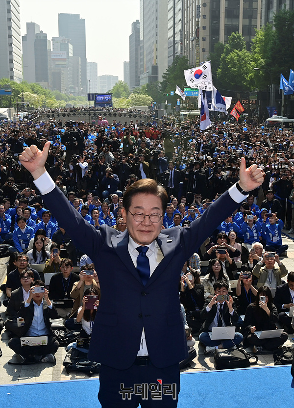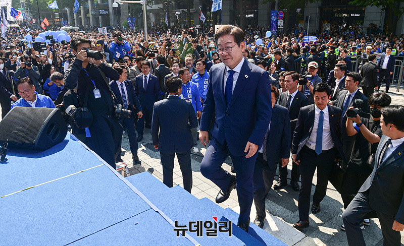 제21대 대통령선거 공식 선거운동이 시작된 12일 오전 서울 종로구 청계광장에서 열린 더불어민주당 중앙선거대책위원회 출범식 및 첫 유세에서 이재명 더불어민주당 대통령 후보가 연단에 오르며 지지자들에게 인사하고 있다.