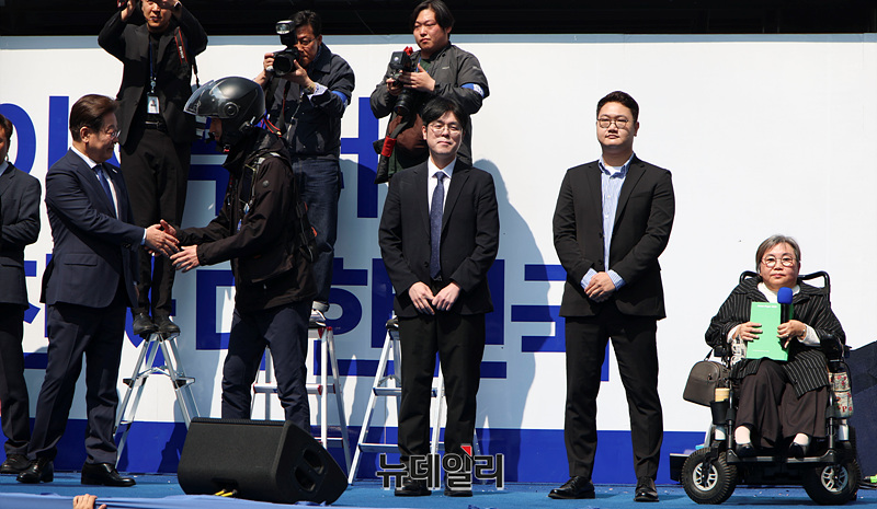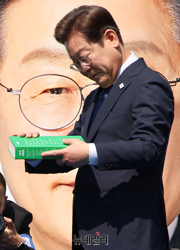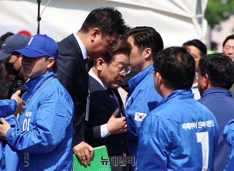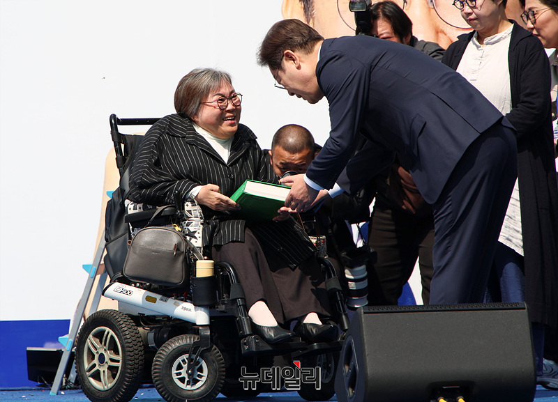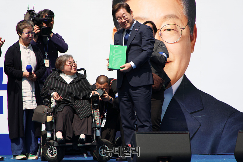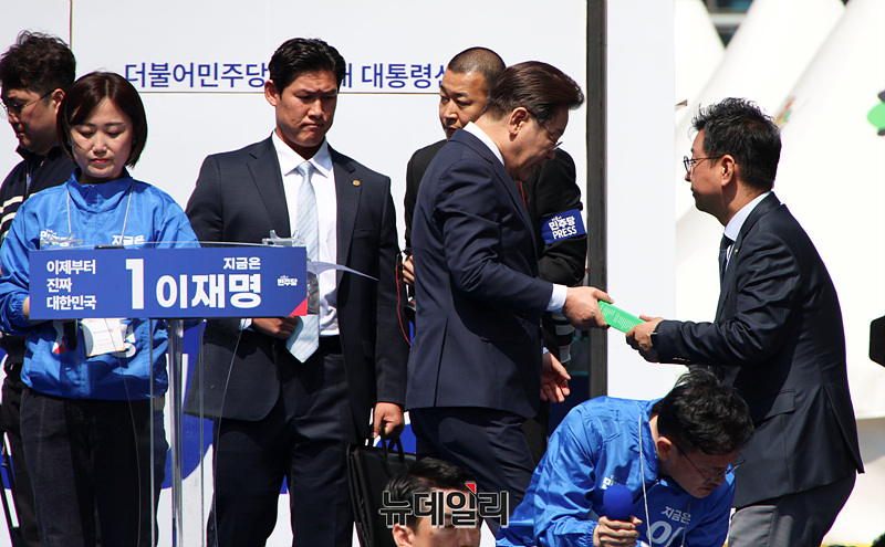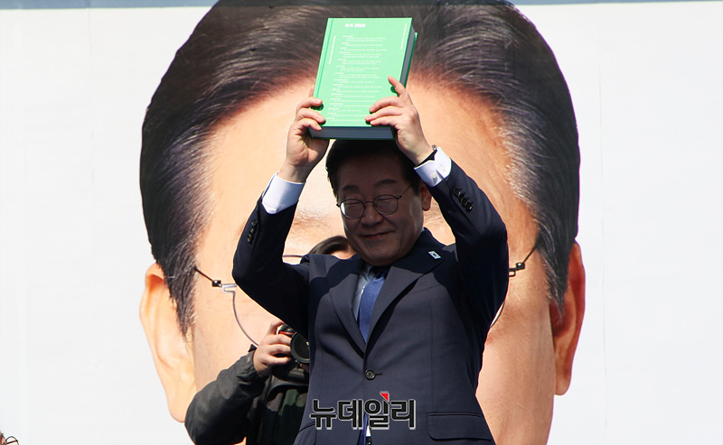 제21대 대통령선거 공식 선거운동이 시작된 12일 오전 서울 종로구 청계광장에서 열린 더불어민주당 중앙선거대책위원회 출범식 및 첫 유세에서 이재명 더불어민주당 대통령 후보가 녹서를 전달받고 있다.