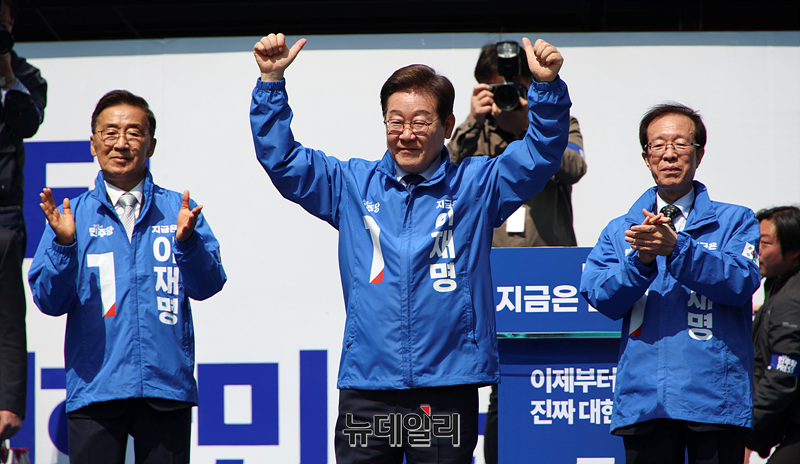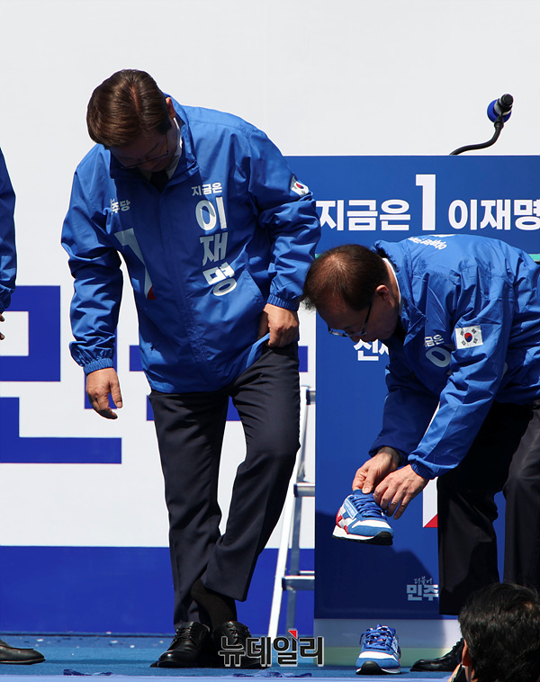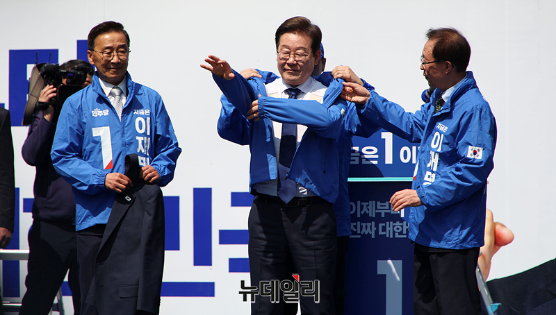 제21대 대통령선거 공식 선거운동이 시작된 12일 오전 서울 종로구 청계광장에서 열린 더불어민주당 중앙선거대책위원회 출범식 및 첫 유세에서 이재명 더불어민주당 대통령 후보가 선거운동복과 운동화를 착용하고 있다.