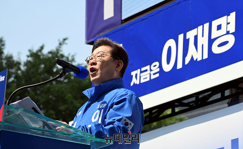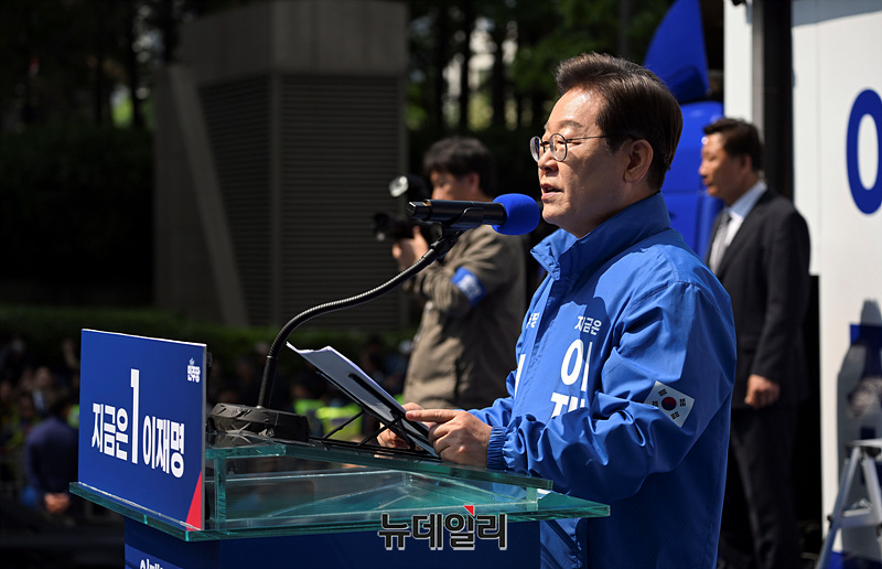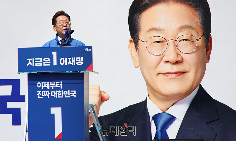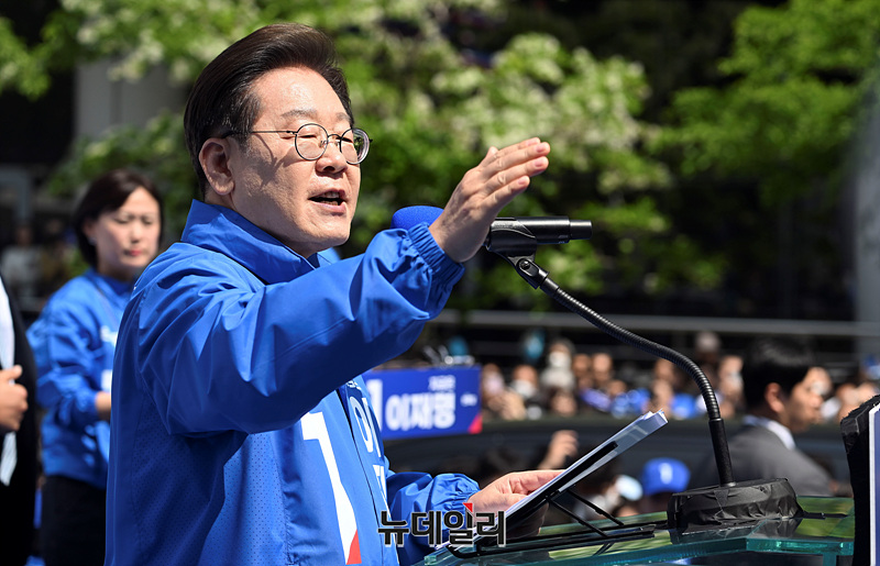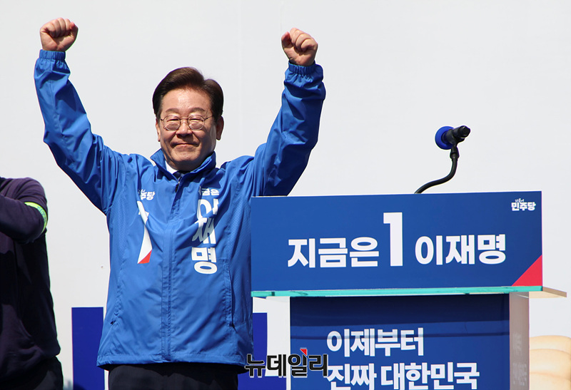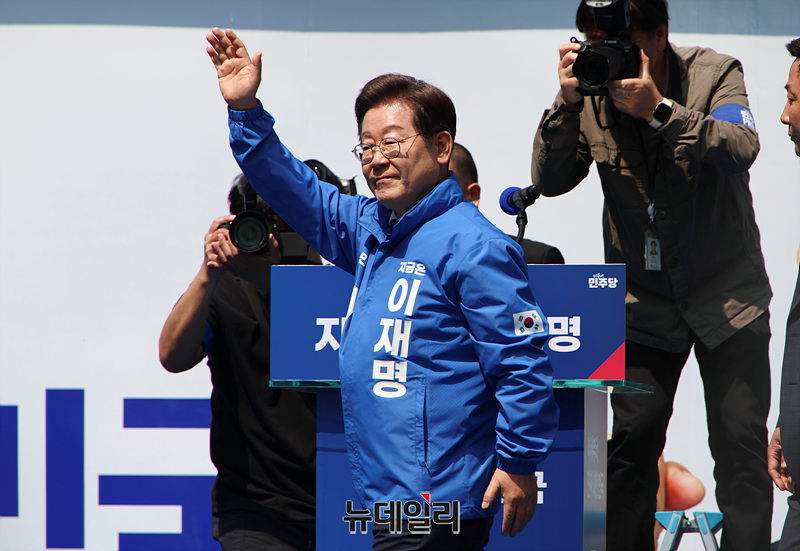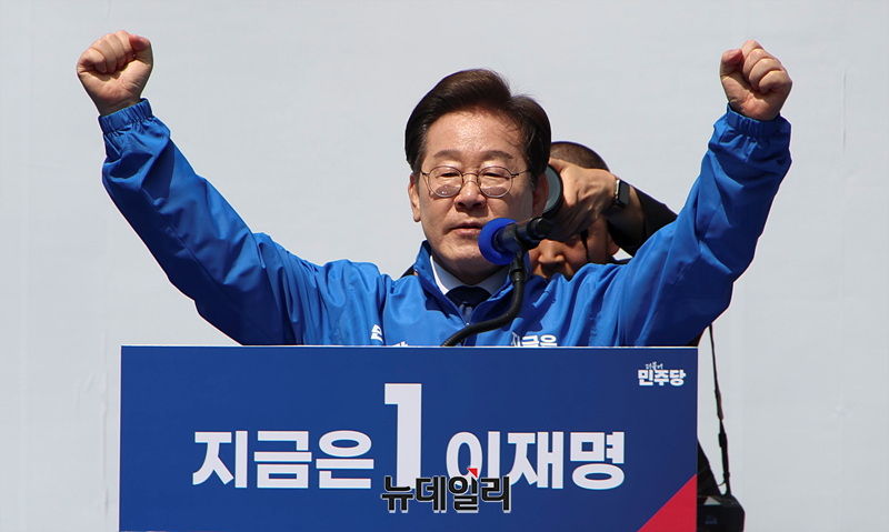 제21대 대통령선거 공식 선거운동이 시작된 12일 오전 서울 종로구 청계광장에서 열린 더불어민주당 중앙선거대책위원회 출범식 및 첫 유세에서 이재명 더불어민주당 대통령 후보가 지지를 호소하고 있다.