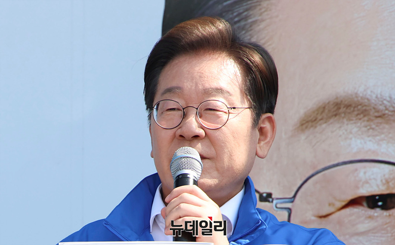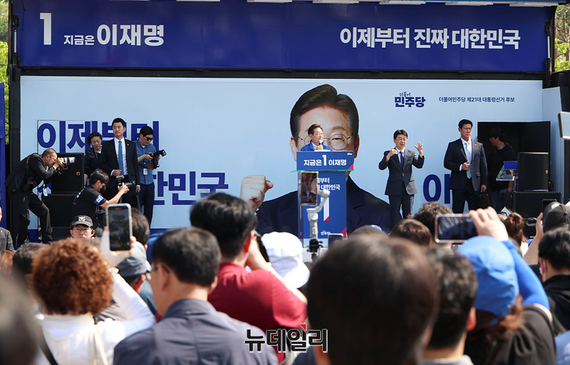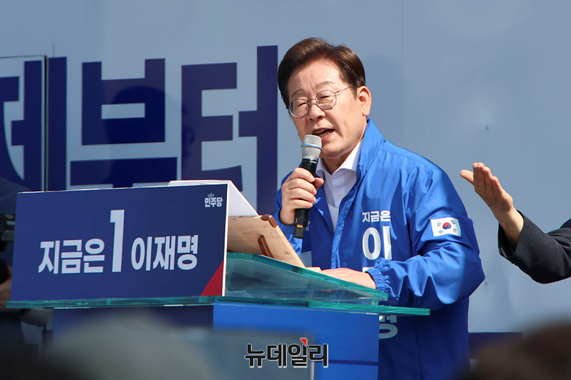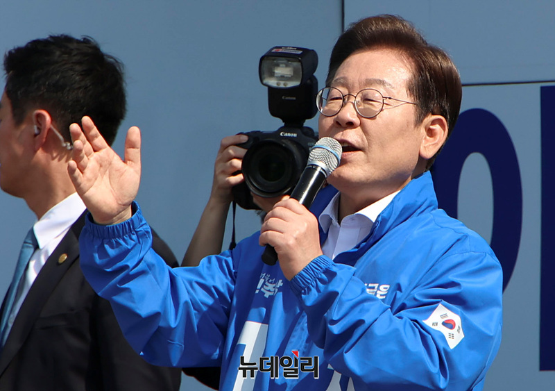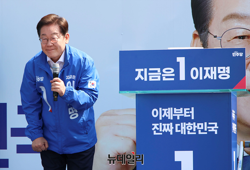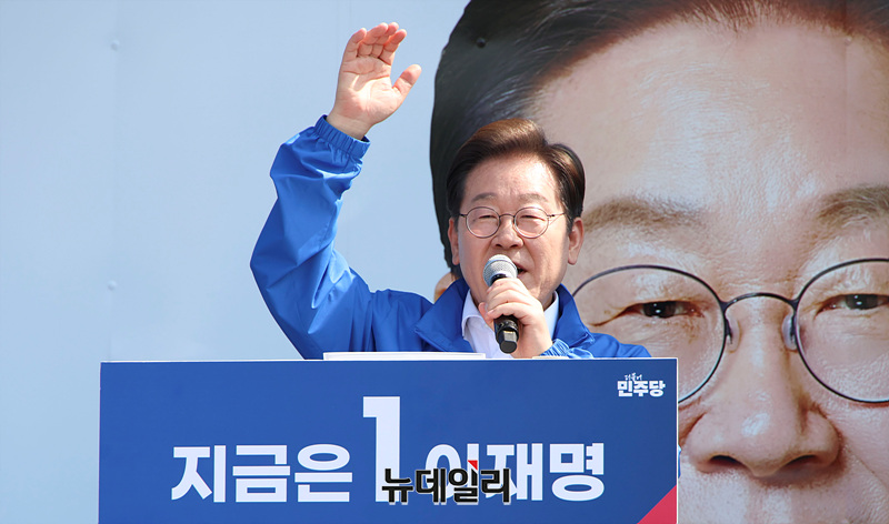 제21대 대통령선거 공식 선거운동이 시작된 12일 오후 경기 화성시 동탄 센트럴파크 음악분수중앙광장 유세장에서 이재명 더불어민주당 대통령 후보가 지지를 호소하고 있다.