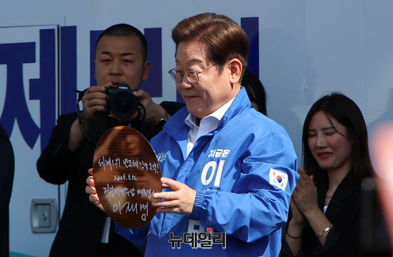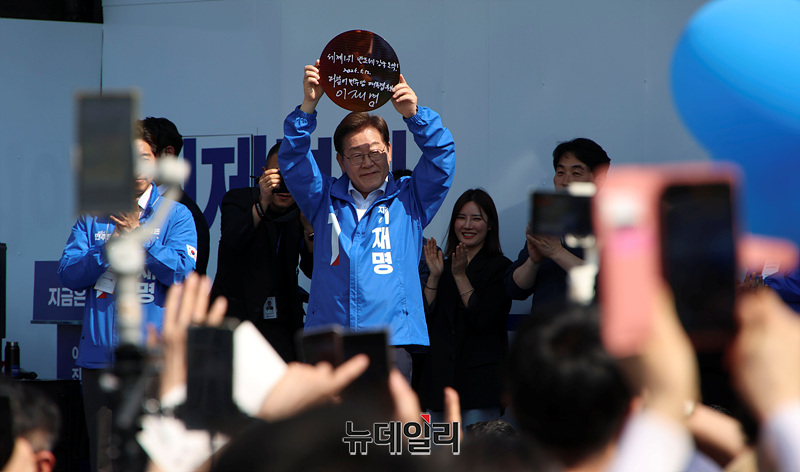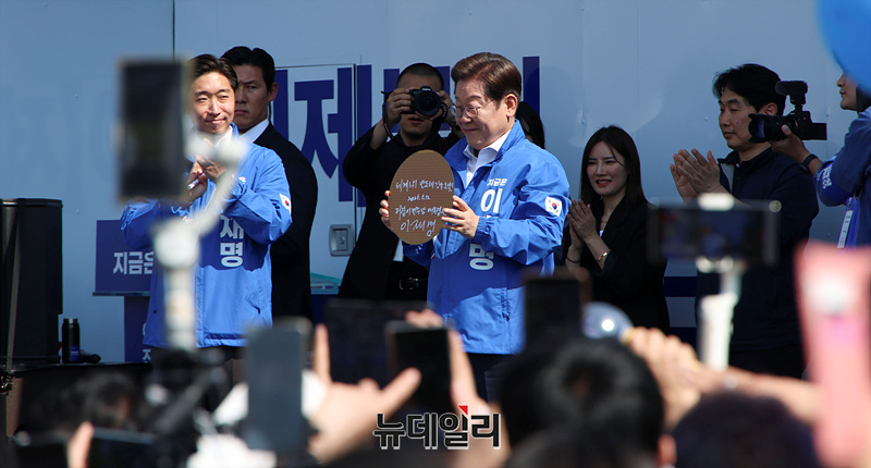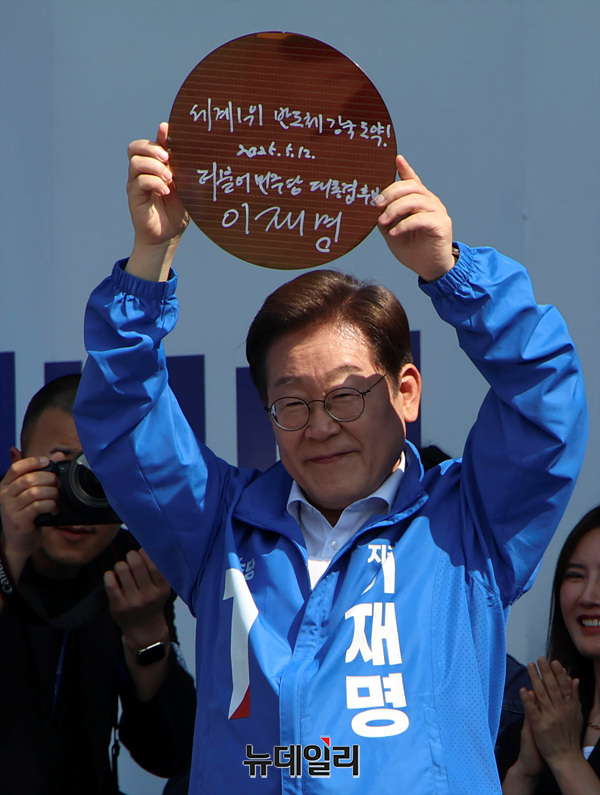 제21대 대통령선거 공식 선거운동이 시작된 12일 오후 경기 화성시 동탄 센트럴파크 음악분수중앙광장 유세장에서 이재명 더불어민주당 대통령 후보가 반도체 웨이퍼를 들어 보이고 있다.