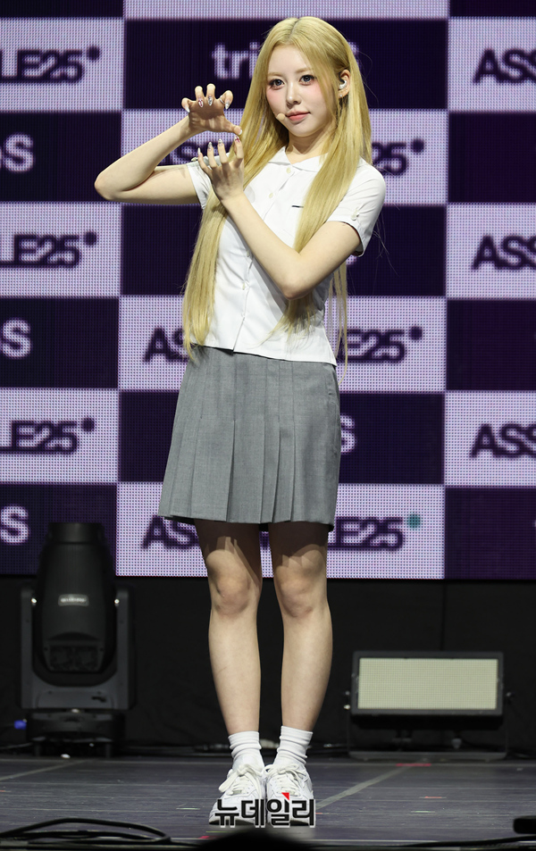 프로젝트 걸그룹 트리플에스 정혜린이 12일 오후 서울 용산구 블루스퀘어에서 열린 새 앨범 'ASSEMBLE25'를 발매 기념 쇼케이스에서 포즈를 취하고 있다. 트리플에스는 이날 오후 6시 타이틀곡 '깨어(Are You Alive)'를 공개하고 컴백 활동에 돌입한다.