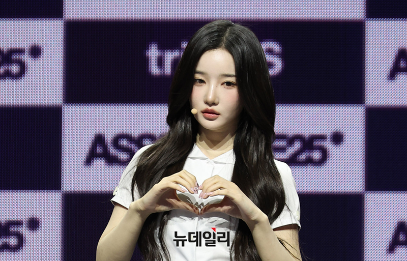프로젝트 걸그룹 트리플에스 김유연이 12일 오후 서울 용산구 블루스퀘어에서 열린 새 앨범 'ASSEMBLE25'를 발매 기념 쇼케이스에서 포즈를 취하고 있다. 트리플에스는 이날 오후 6시 타이틀곡 '깨어(Are You Alive)'를 공개하고 컴백 활동에 돌입한다.