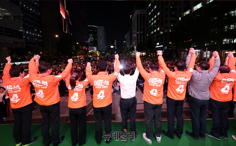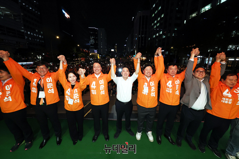 이준석 개혁신당 대선 후보가 제21대 대통령 선거 공식 선거운동 첫날인 12일 오후 서울 청계광장에서 열린 출정식에서 선대위원장들과 손을 들어 인사하고 있다.