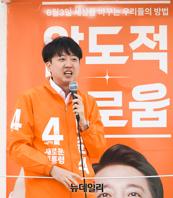 이준석 개혁신당 대선 후보가 13일 오전 대구 달서구 죽전네거리에서 열린 유세현장에서 지지를 호소하고 있다. (대구=서성진 기자)