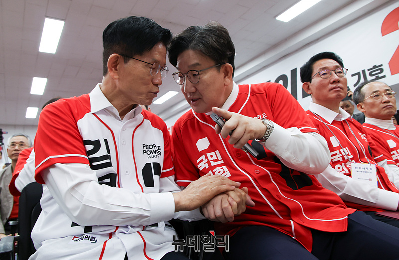 김문수 국민의힘 대선 후보가 13일 오전 국민의힘 대구시당에서 열린 대구경북선거대책위원회 출정식 및 임명장 수여식에서 권성동 공동선대위원장과 대화를 나누고 있다.